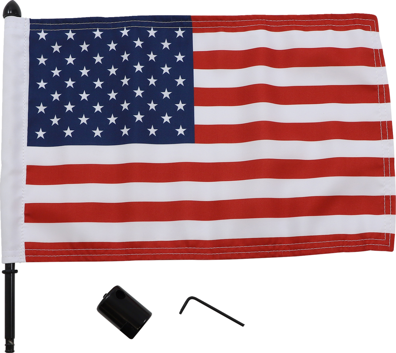 Polished 304 stainless steel mount bolts directly to the square 5/8" sport racks on Softail, Sportster and Dyna GlideMount, as well as pole, can be easily detached via a small setscrewIncludes an American flagOther flags also available; sold separatelyMade in the U.S.A.