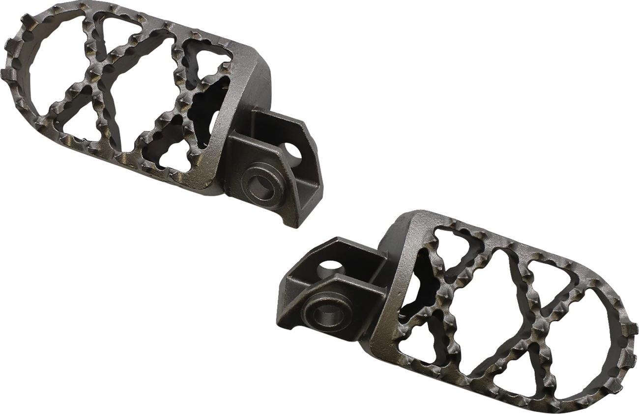 Constructed from cast, heat treated and hardened 17-4 stainless steelWidth (57 mm) and length (90 mm); slightly convex platform for better boot positioning and grip when leaning forward or backLarger surface area with serrated teeth for positive grippingMade for the aggressive riderMade in the U.S.A.Specs