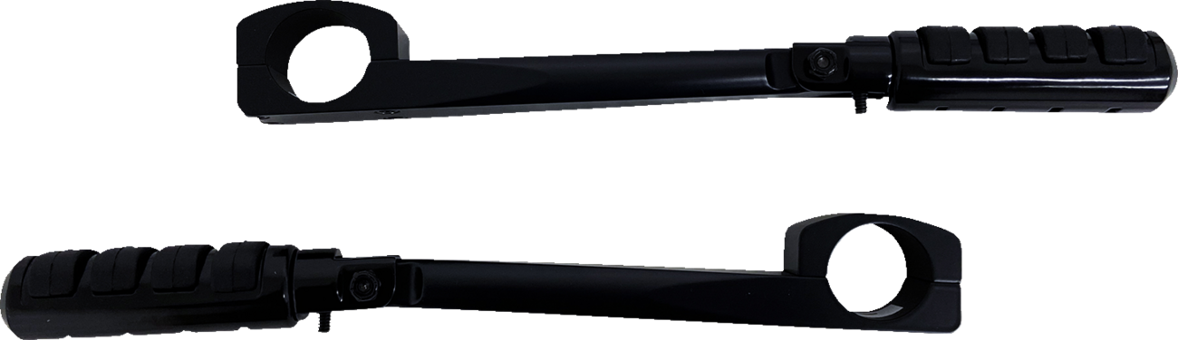 Mounts directly to the front frame downtubeBlack powder coated and machined from billet aluminumBoth forward and backwards adjustment to fit most leg lengthsAnti-vibration pegs includedMade in the U.S.A.