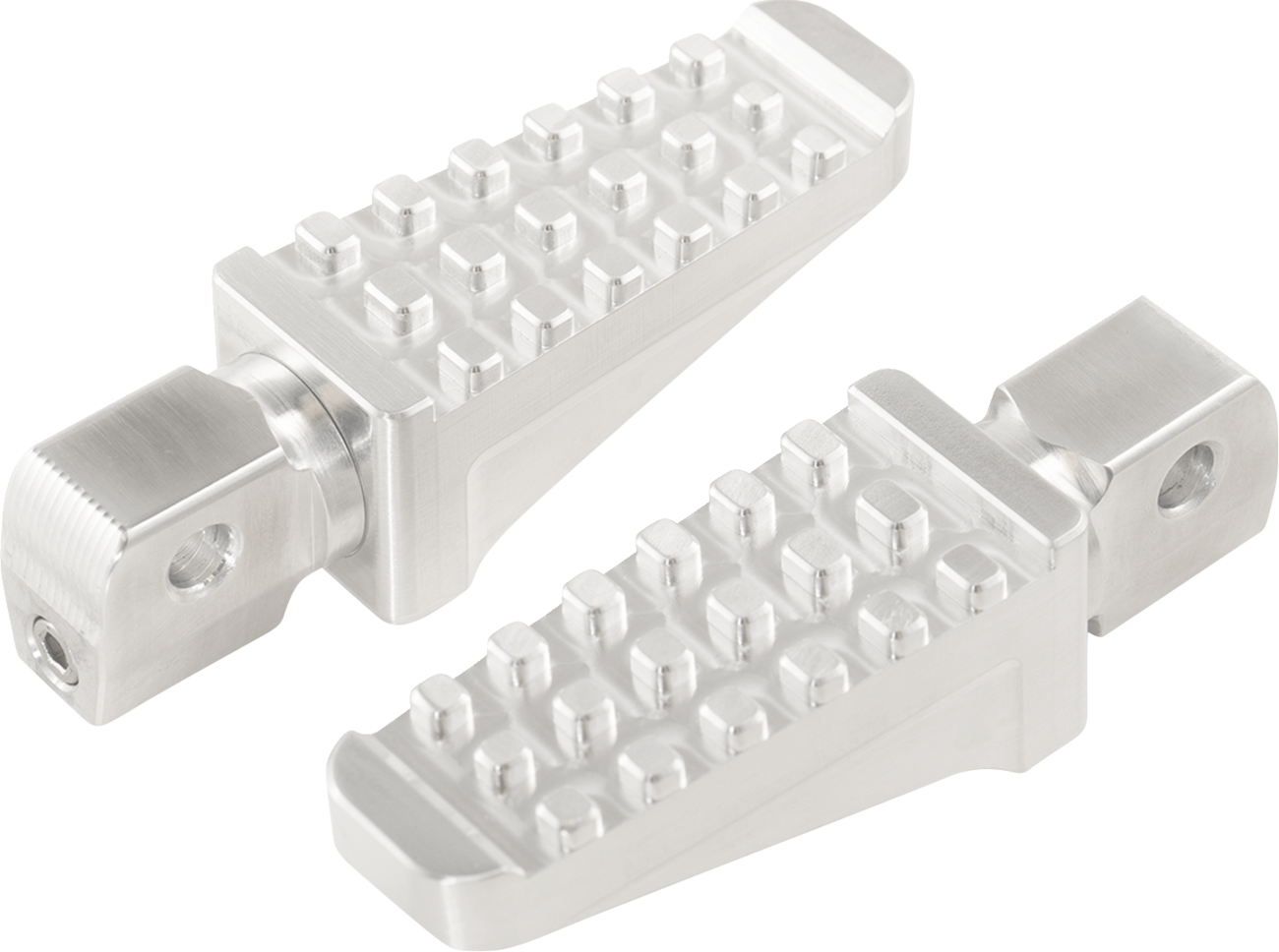 Fully CNC machined from solid 6061-T6 barSuper strong, yet light-weight 2 piece constructionWider foot surface for a comfortable rideShort design gives you more lean angleSerrated surface provides a good bite to the bottom of your shoeFull 360 degree footpeg rotation makes these footpegs perfect for any applicationPitch adjustment screw always keeps them in a good riding positionMade in the USASpecs