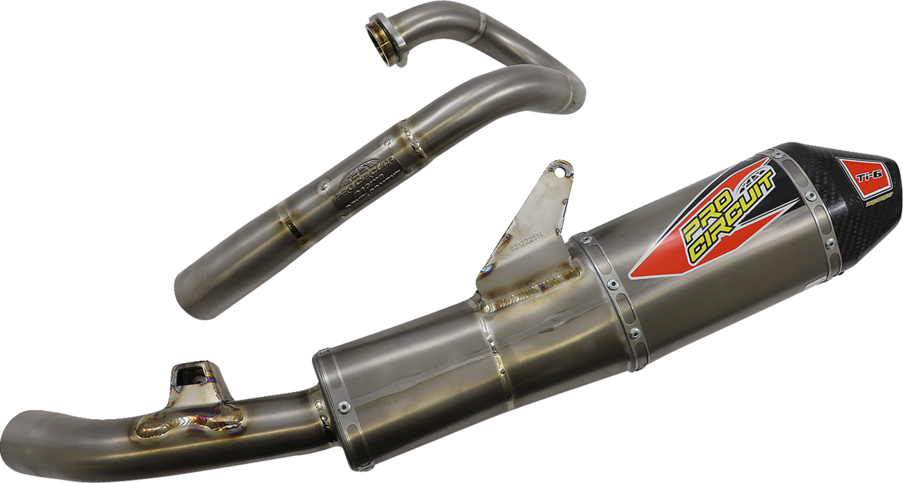 Ti-6 titanium exhaust is designed to improve performance and powerConstructed of titanium throughout the headpipe, mid pipe, and canisterFor any off-road or closed course racer looking for improved performance, durability, and a professional lookComes with a removable USFS approved spark arrestor making it easy to alternate between off-road and closed course ridingMachined aluminum muffler brackets for increased strength and durabilityAsymmetrical muffler configuration for increased packing volumeMost systems equipped with a RC-4 Response Chamber for reduced sound output machined mid pipe to headpipe joint for a better, leak-free fitTIG precision weldingMade in the U.S.A.Specs