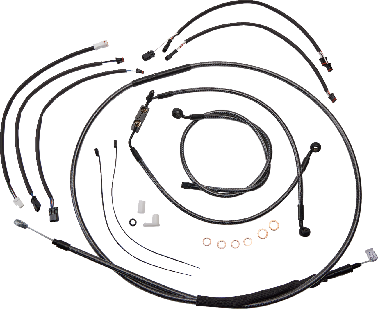 • Kit includes – Premium brake lines, clutch cable or hydraulic clutch line, throttle and idle cables or throttle-by-wire extensions, hardware, and fully terminated or plug-and-play switch and turn signal extensions