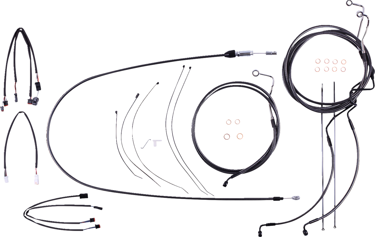 • Kit includes throttle and idle cables of throttle-by-wire extensions, clutch cable or hydraulic clutch line, brake lines, copper crush washers, hardware, and any necessary switch wiring of turn signal extension