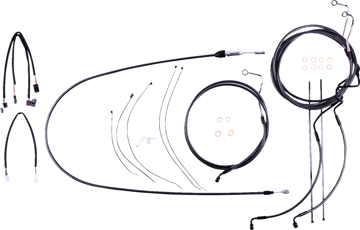 • Kit includes throttle and idle cables of throttle-by-wire extensions, clutch cable or hydraulic clutch line, brake lines, copper crush washers, hardware, and any necessary switch wiring of turn signal extension
