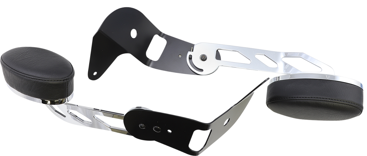 Chrome-plated, CNC-machined billet aluminum construction with padded and upholstered cushionsHidden steel mounting plates fit directly behind passenger backrestIncludes cup holder mounting bracket (cup holder not included)Fully adjustable in both height and width for maximum comfortArms pivot vertically to allow easy trunk accessSpecs