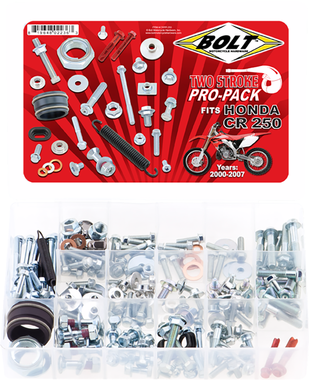 Includes sub-frame bolts, fork guard bolts, radiator shroud bolts, M5, M6 & M8 hex flange bolts, seat bolts, rotor bolts, a full set of sprocket bolts, t-nuts, factory style aluminum bushing for the bodywork, valve stem grommets & caps, fuji lock nuts, drain plug washers and oil filter o-ringsDesigned for Honda modelsSpecs
