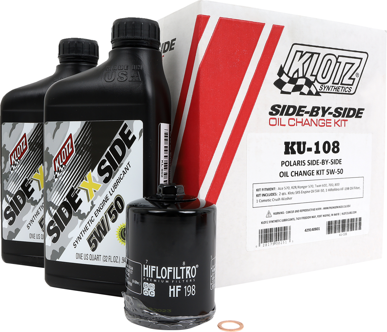 Developed for extreme loading stresses of off-road useExtra film strength protects engine parts from metal to metal contactIdentifiable Klotz red and racy scentFor use in integrated and non-integrated transmissionsProvides smoother, quieter clutch and transmission operationTwo quarts of Klotz SXS engine oil 5W50One Hiflofiltro HF-198 oil filterOne Cosmetic crush washer