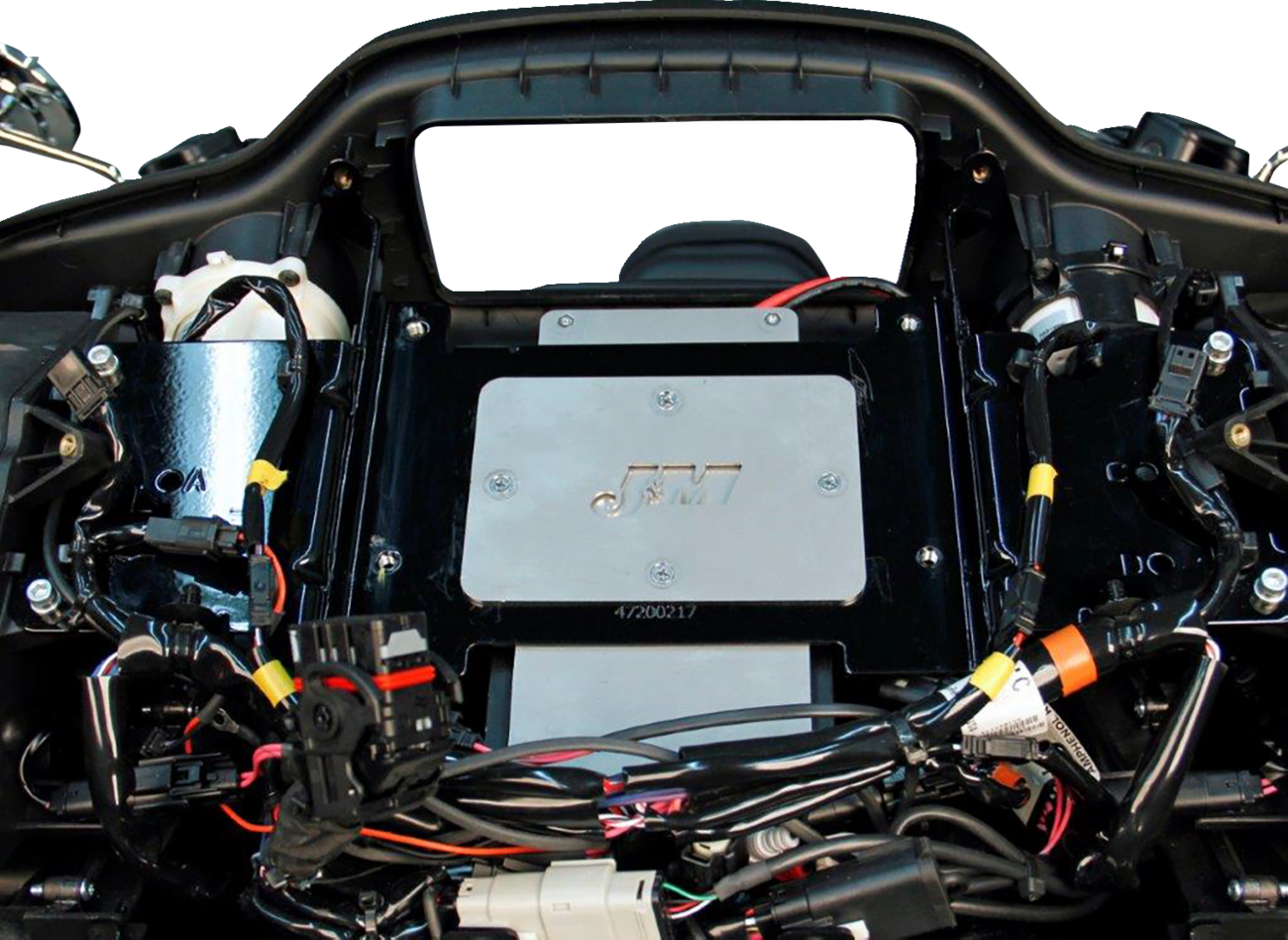 Amplifier mounts to the Lazer-cut stainless steel 2-piece bracket system, to provide solid and secure mounting inside the fairing
