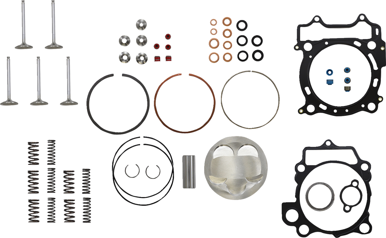 • Kit includes all necessary parts for a complete top-end service/rebuild: pistons, piston rings, piston pins, gaskets, valves, and valve springs