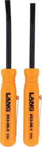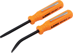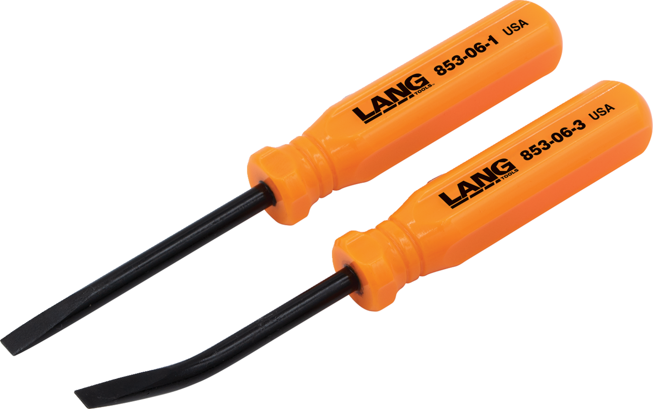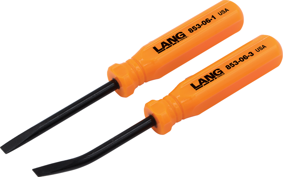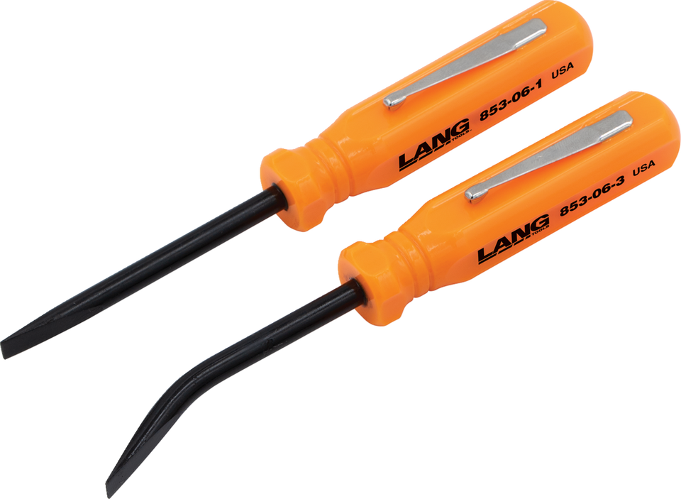 Blades made from 3/16" diameter hardened alloy steelConvenient for prying/separating small items apartAngled blades give greater access to tight areas2-pc set includes a 0° and 27° angled bladeAcetate handle with pocket clipMade in the U.S.A.Overall length: 5"