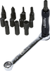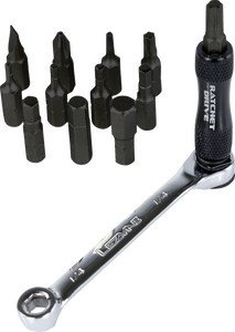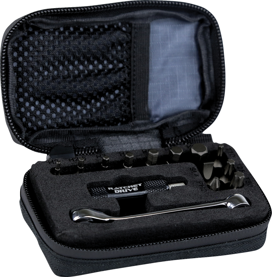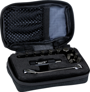 Durable and compact chrome-plated ratchet tool designed for on-the-go useFine-tooth mechanism offers speedy engagement for quick adjustments in even the tightest spacesThe hardened CRV bit selection has been optimized for modern road, gravel, and mountain bikes and comes paired with a machined-aluminum extension adaptorAn integrated magnet in the included soft-shell carrying case holds tool bits securely in placeTool bits include: Hex 2, 2.5, 3, 4, 5, 6, 8 mm, Star shaped T10, T25, T30, Flat head and Phillips head