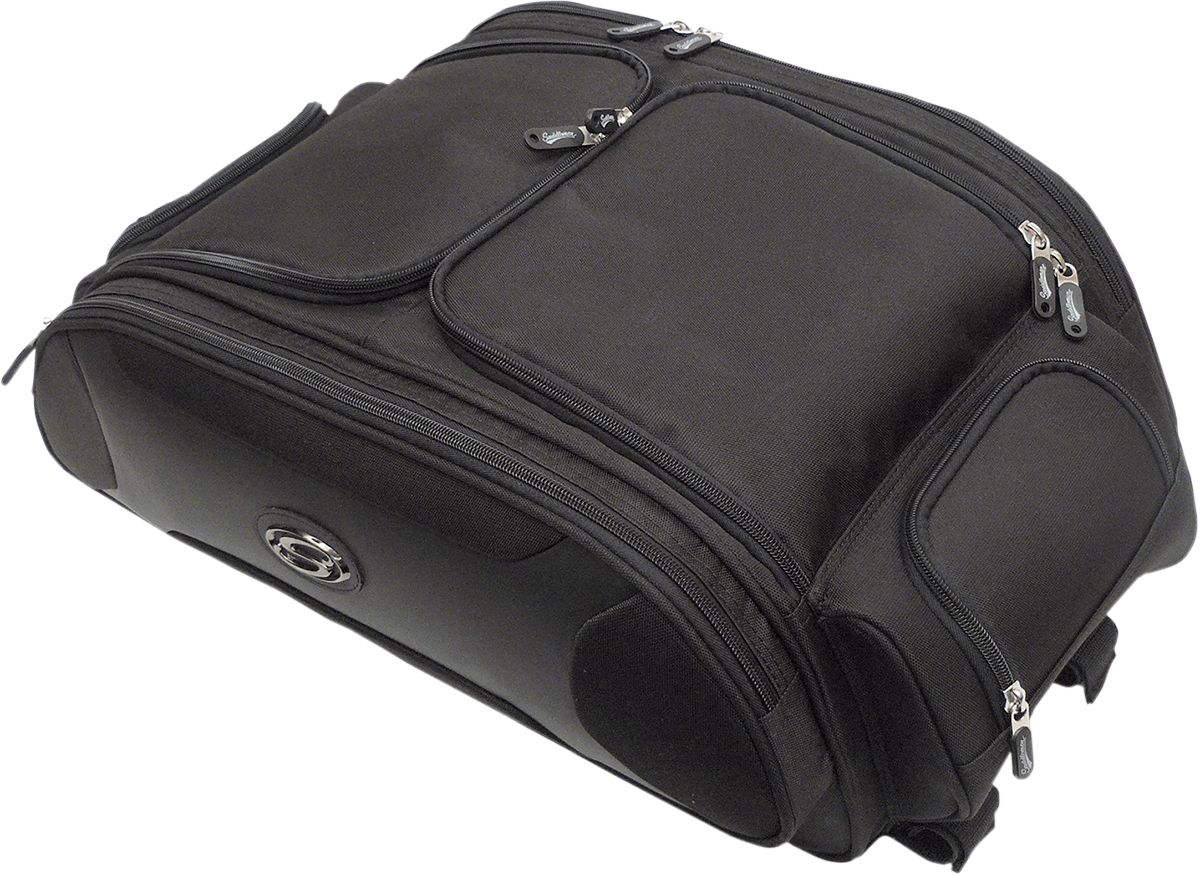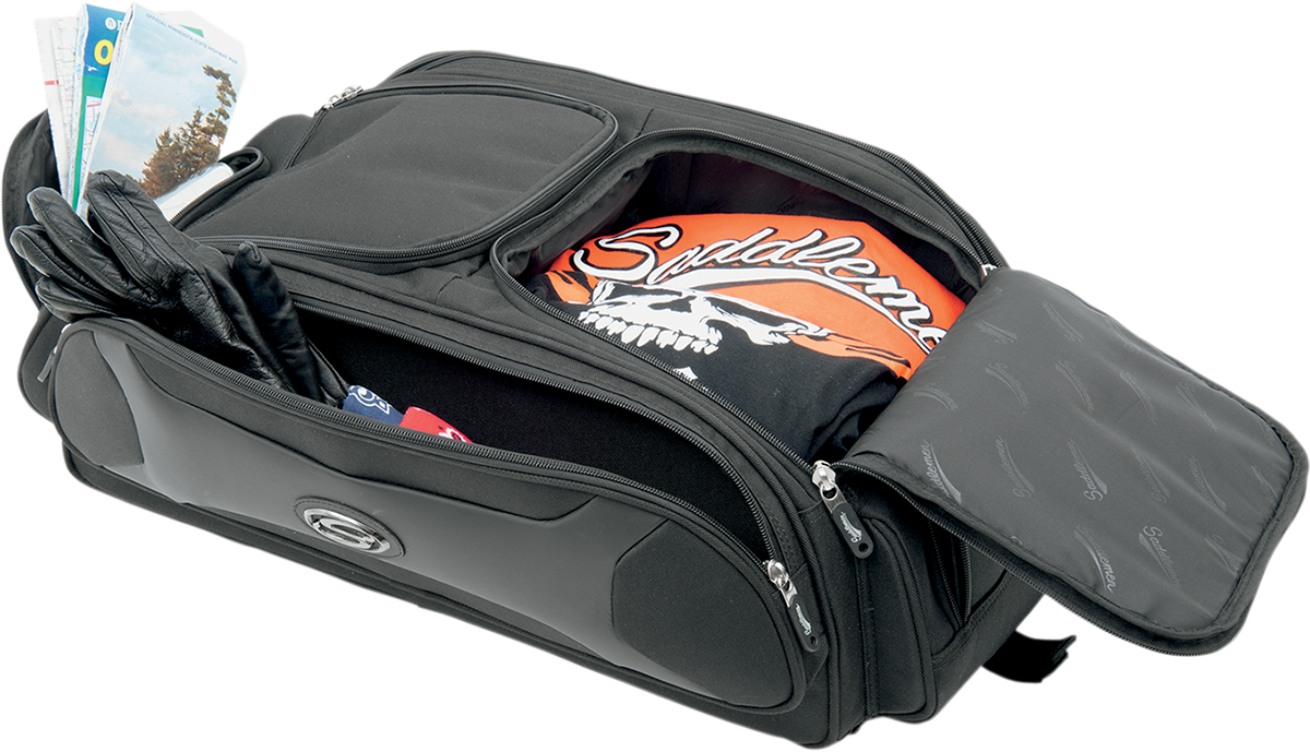 A sharp collection of motorcycle luggage from Saddlemen; the FTB line features a bold, yet sporty look with an array of vital features bundled with superb construction and class-leading value pricingThis trunk and rack bag mounts in moments without fuss, using rugged nylon straps and clips attached directly to the body of the bagBrings never-before-seen style to the top of your touring bike’s trunk, trunk rack or large rear rackSemi-rigid walls, specially contoured for style and load capacity, hold their shape regardless of your cargoGull-wing top flaps have perimeter zippers that open wide for easy loading and unpackingIf the weather gets wet, use the supplied high-visibility, light-reflective rain cover to protect the bag and its contentsFTB3300 dimensions: 22-1/2" W x 9" H x 12" D (bag excluding pockets) and 26" W x 9" H x 15" D (bag including pockets); capacity 10 lb.