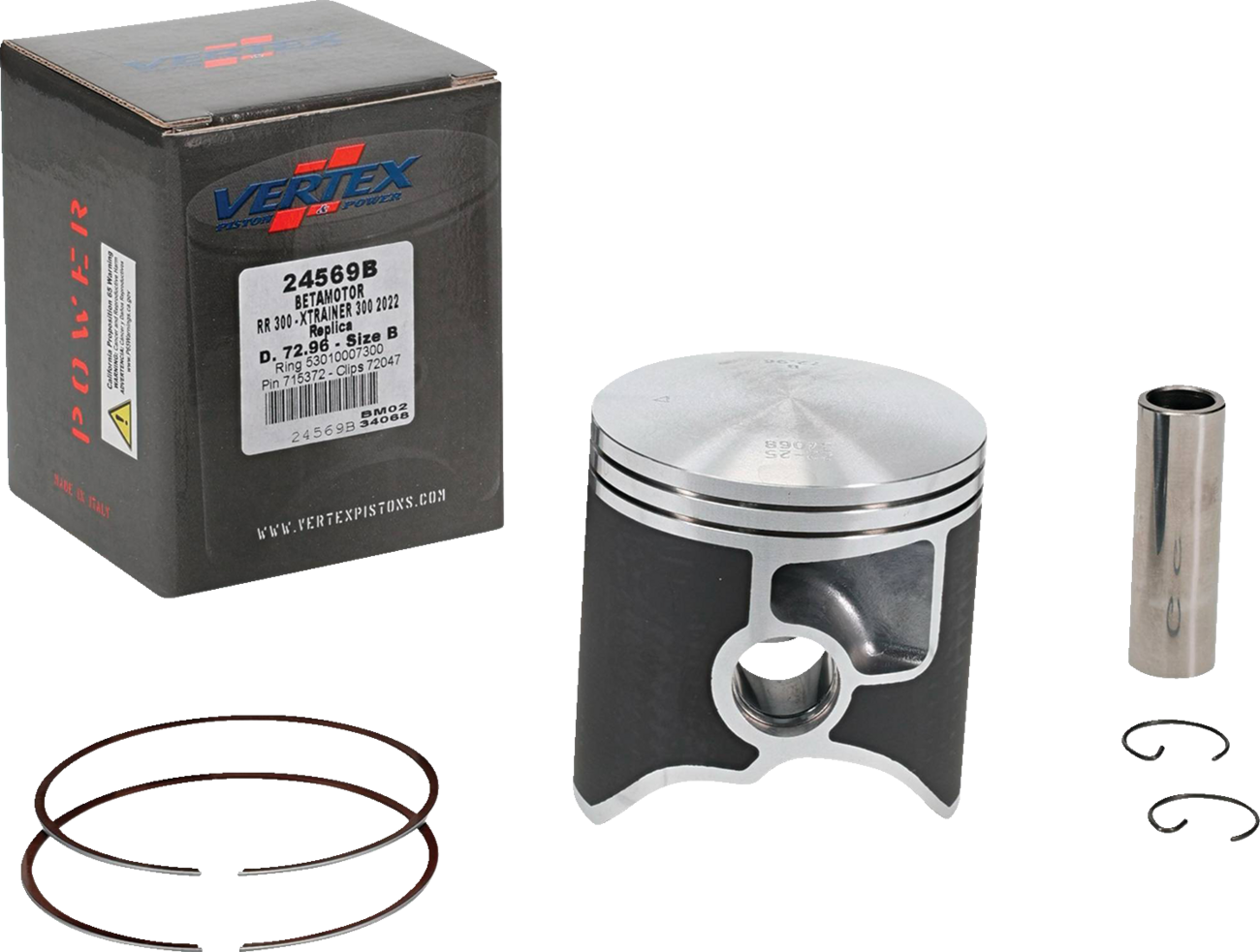 Kit includes piston, ring set, wrist pin and circlipsGravity cast aluminum alloy with 18% silicon to increase resistance to wear and decrease thermal distortion Coated skirt eases break in, decreases wear and aids in lubricationPiston rings are either nitride or chrome platedWrist pin is nitride coated, providing a hardened, wear resistant bearing surfaceSpecs