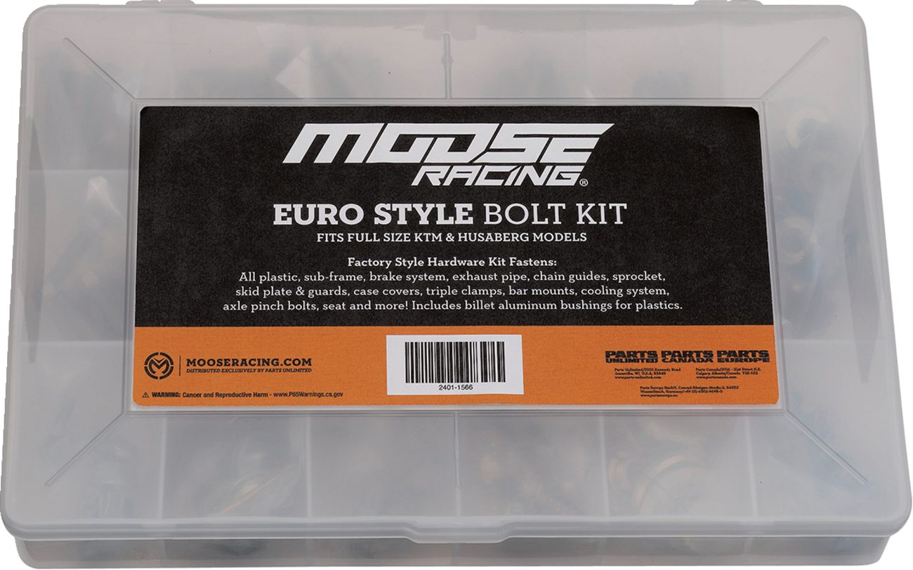 Comprised of 170 pieces including factory-style KTM hardware, bolts, aluminum washers and concave washers, as well as dimpled flange bolts, carb screws, body screws, sprocket bolts, clips, valve stem parts and more