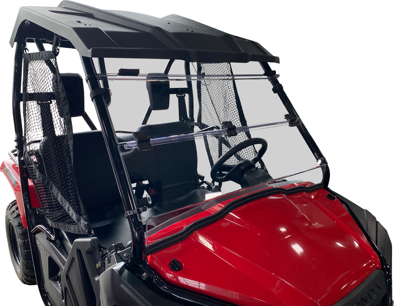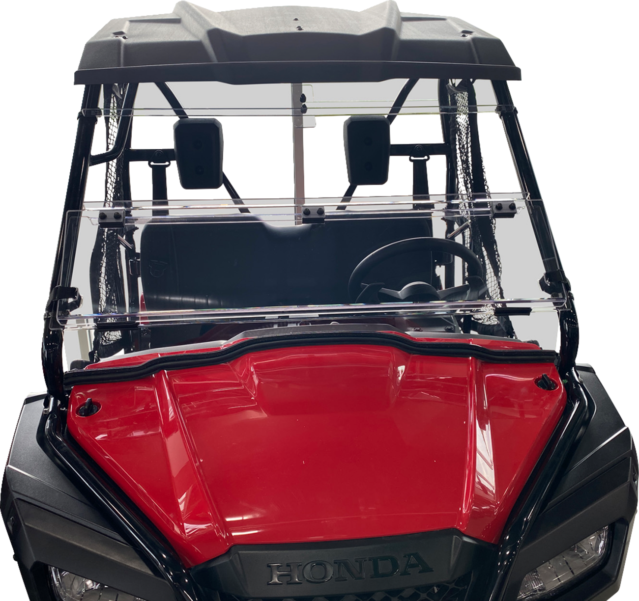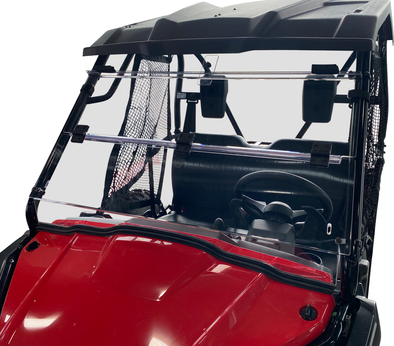 Provides full windshield protection with the option to fold down the Middle part of the windshield to allow for better air flow and/or visibilityDesigned to work with the OEM roof while not leaving large gap between the top of the windshield and the roofAttaches to the roll cage using four profile clampsThe middle section of the windshield is attached using three hinges with a unique fold to prevent water intrusion at the hinge lineThe top of the folding part of the windshield is connected to the roll cage with two hook-and-loop strapsMade in the USASpecs