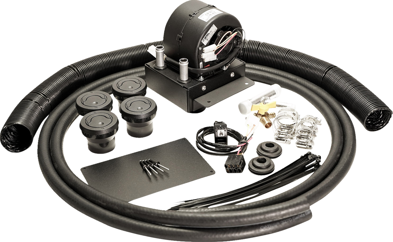 12 volt universal cab heater kit for UTVs with 1" (2.54 cm) and 3/4" (1.9 cm) radiator hosesQuick and easy installationTypically installs in about an hourWater operatedMade in the USASpecs