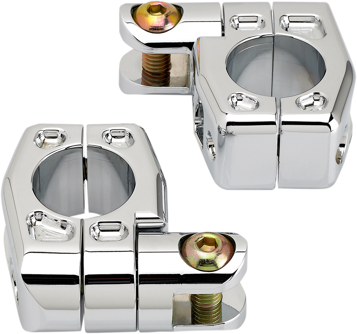 Fit front engine guards with 1-1/4" tubingWork with all Harley Davidson-style male-mount foot pegsMade from 6061-T6 billet aluminumSet footpeg position 1-1/8" in or out from the center of engine guard tubingAllow footpegs to be rotated 360 to accommodate any riderMade in the U.S.A.
