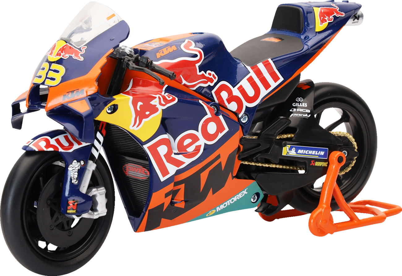 Mini MotoGP bike features iconic Red Bull and KTM logosMini stand keeps bike upright during display1:12 scale figure is about 7" (17.78 cm) long