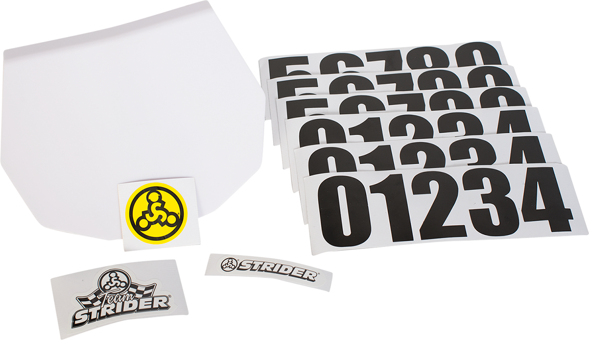 Give your child’s Strider a motocross look with an official Strider number plateMakes backyard pump tracks and neighborhood races way more officialThe easy-to-attach plate is fully customizable and includes sticker sheets featuring numbers 0-9 and other customizing stickersCompatible with Strider 12" balance bikes