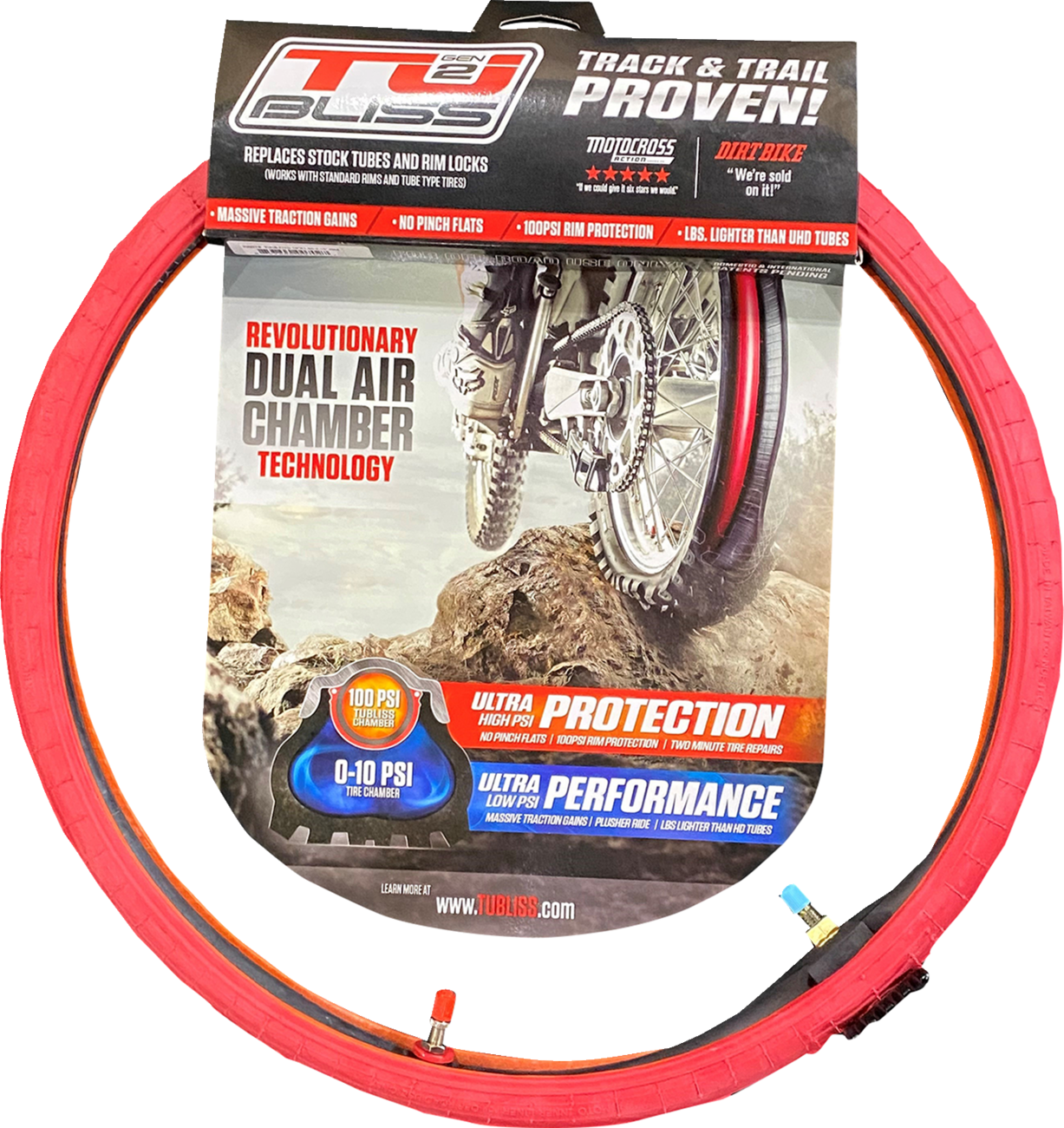 • Dual air chamber system that replaces conventional tubes with a high pressure, rim protecting inner bladder acting as a 360° rim lock that seals the tire to the full circumference of the rim