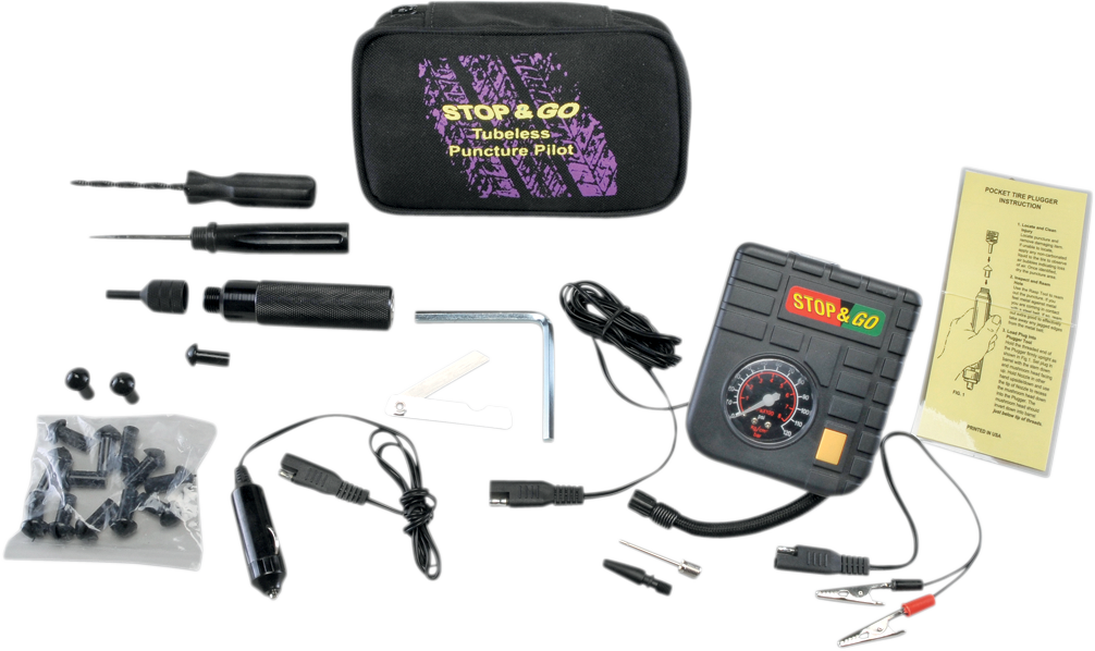 12 Volt compressor unit features built-in gauge and LED Light, 66" power cord that fits Battery Tender connectors, 12" (EU: 30,48 cm) alligator extension clips, 36" (EU: 91,44 cm) extension lighter adapter and 4" (EU: 10,16 cm) tire valve hose with sports needle and inflatable adapterIncludes the Pocket Tire Plugger with 15 mushroom-shaped rubber plugs and the compact mini air compressorKit fits into a durable zippered canvas case that measures only 7" x 4" x 3" (EU: 17,78 cm x 10,16 cm x 7,62 cm) and weighs just 1.7 lbs (EU: 771,11 g)Kit allows for on-the-wheel repair to tubeless tires to re-inflate it on the spotMushroom plugs measure 5/16" (EU: 0,79 cm) diameter shaft x 3/4" (EU: 1,91 cm) in length and work on all tubeless tiresIdeal for motorcycles, scooters, mowers, small tractors, golf carts and ATVs