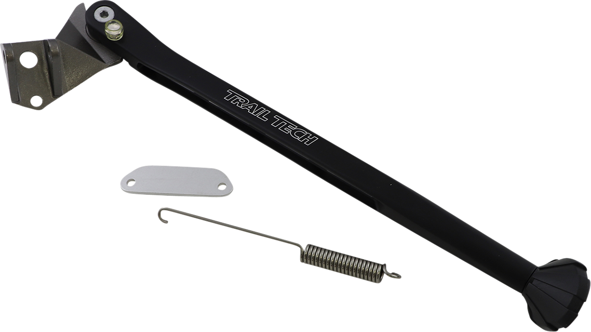Custom designed, strong, lightweight and attractiveUltra-high-strength chromoly mounting bracketLightweight, high-strength forged aluminum standAluminum reinforced high-impact nylon foot at base of stand with no sharp edgesExtra-tough black ceramic coatingTucks out of the way of the riderMeasure 15-1/2" LEasy installation with no modifications required (mount to stock mounting points)Specs