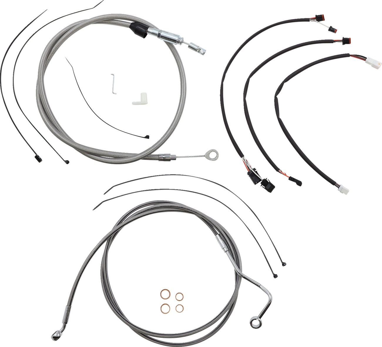 Kit includes throttle and idle cables or throttle-by-wire extensions, clutch cable or XR hydraulic clutch line, XR brake lines, copper crush washers, hardware, turn signal and switch wiring extensions