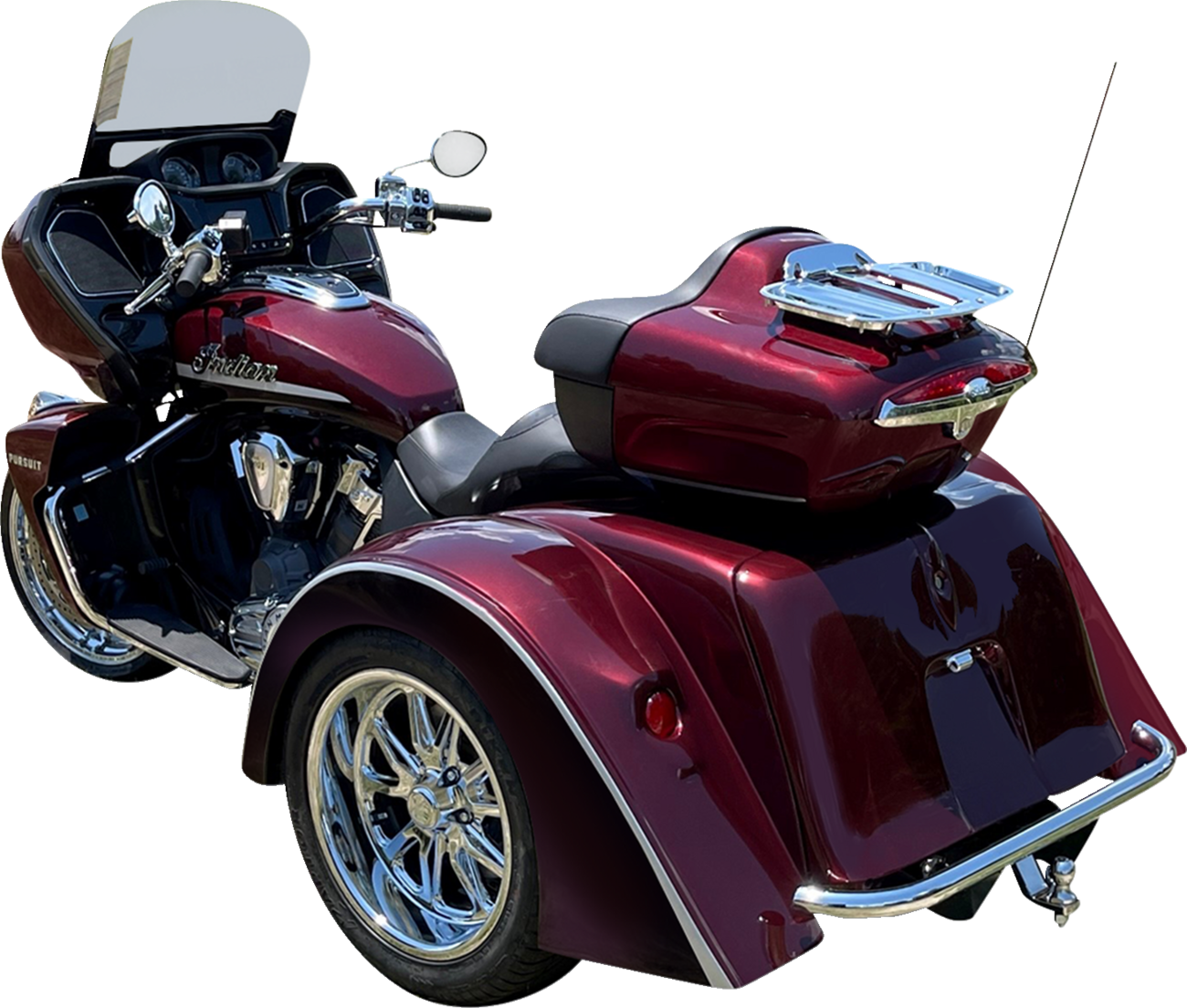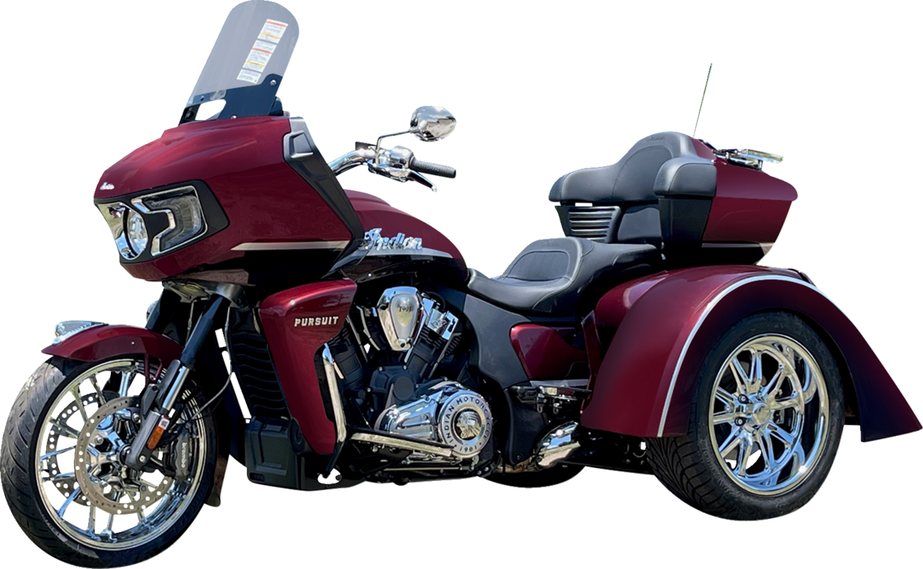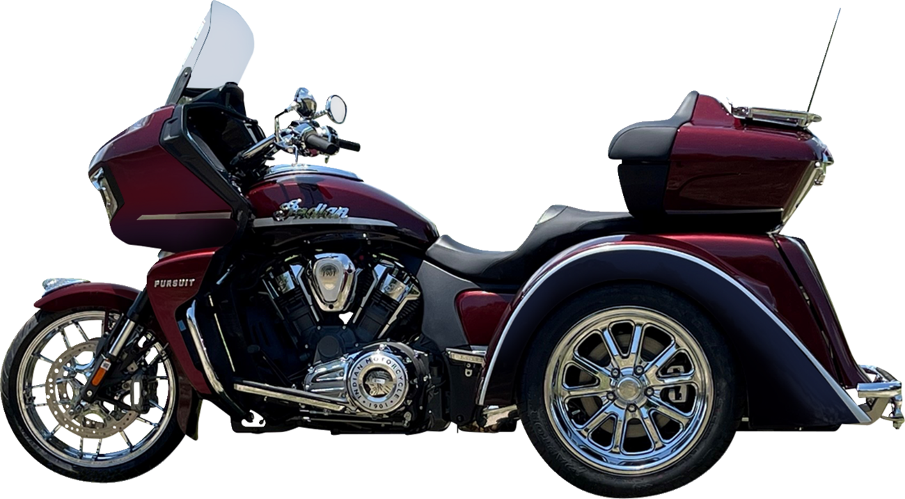 Complete bolt-on application, no welding or fabrication requiredIndependent rear suspension features automotive bushings that insulate the chassis from driveline and suspension vibrationsPatented air ride suspension with on-board compressorLED air suspension and voltmeter readout gaugesProgressive coil-over shocks with 4” plus wheel travel12” rotors and multi-piston disc brakesRetains and utilizes the stock belt and drive pulley15” polished aluminum torque thrust wheels with tiresPolyester resin fiberglass bodyWorks with or without tour packRear fender skirtsTeardrop taillightsIncludes installation instructionsDesigned for stock exhaust but fits with most aftermarket exhaust systems with minimal modificationsSpecs