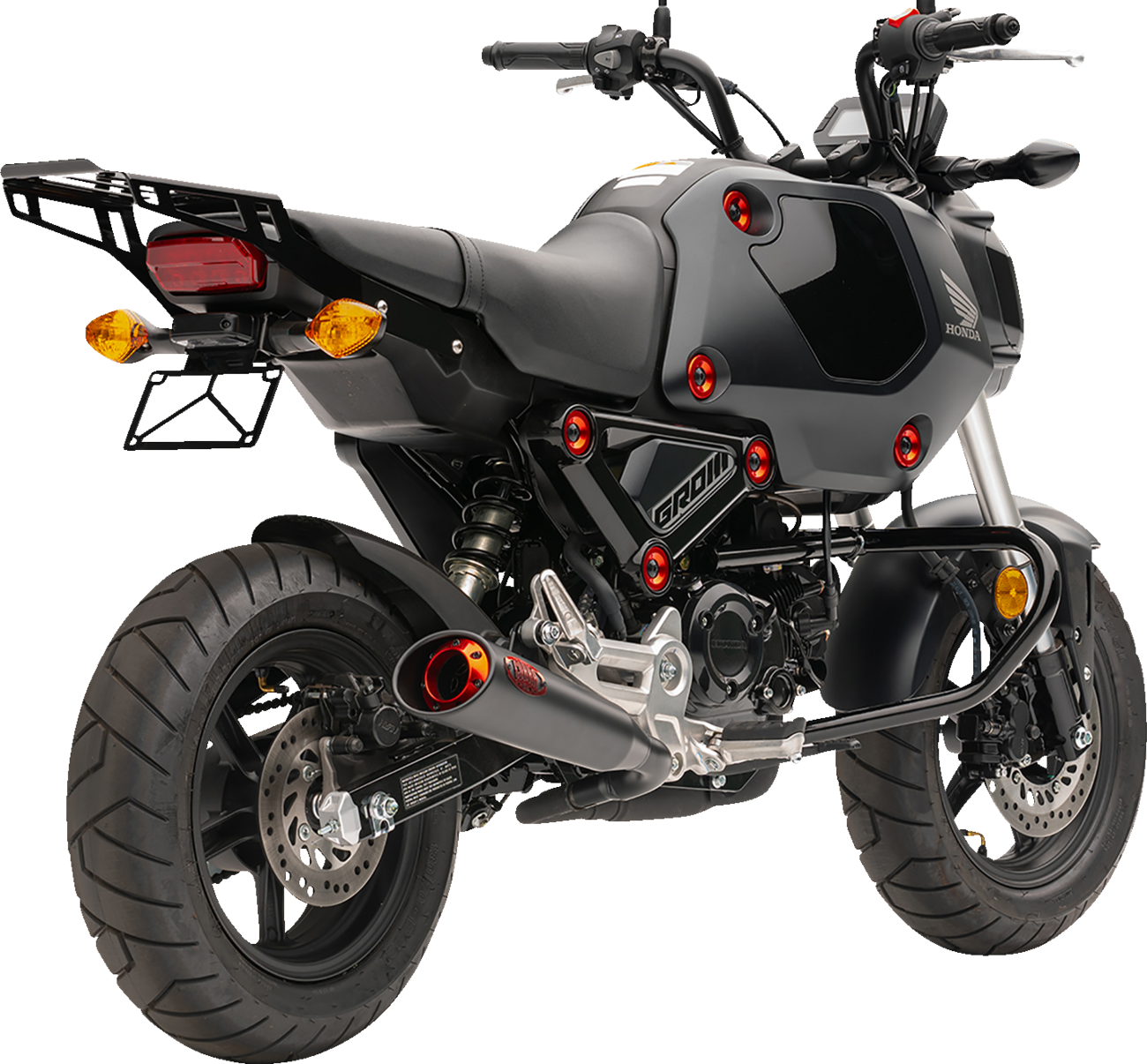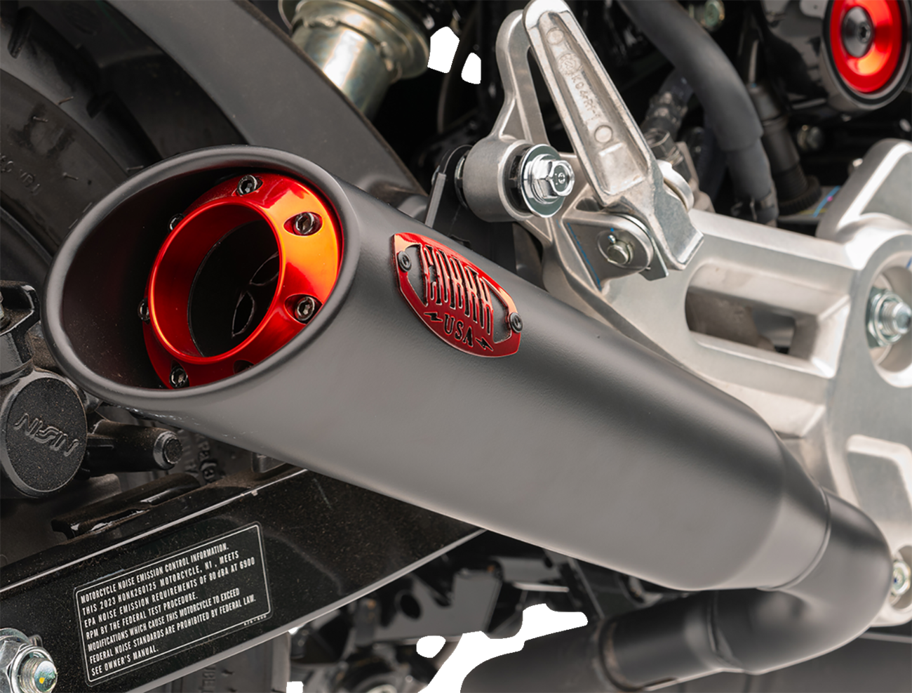 Black power-coated megaphone body with rolled steel end surrounds the inboard machined tipThe aluminum cap and the steel badge are dusted with a translucent lollipop red powder coatingMuffler provides more than a 5.5% horsepower gain50-State legalMade in CaliforniaSpecs