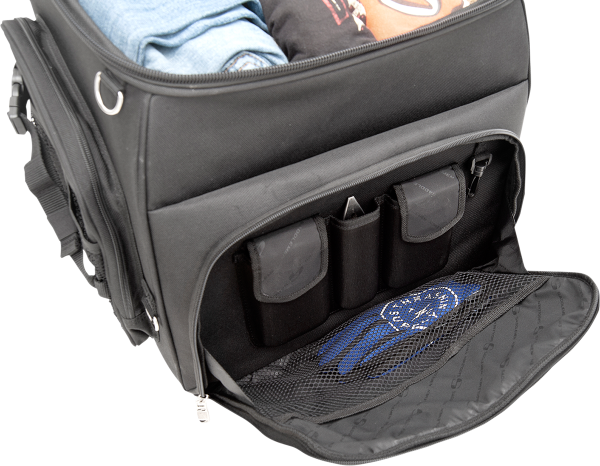 Two mounting systems included - a seat harness or adjustable sissy bar strap system easily attaches bag to your motorcycle's seat, luggage rack, or sissy bar