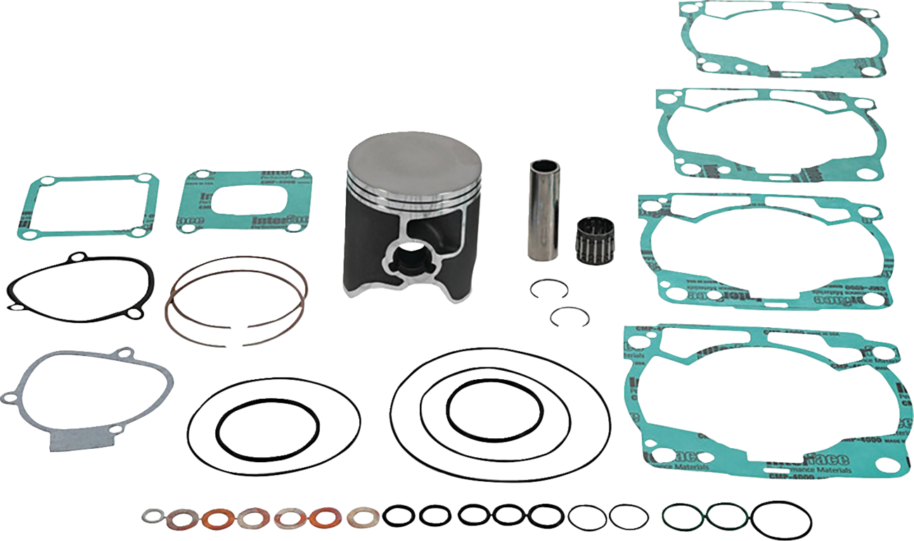 The piston is heat treated with a T-5 hardening and tempering cycleThe piston skirt is coated with a high-tech Molybdenum Disulphite coating for faster break-in time and increased piston lifeGravity-cast aluminum alloy (not forged) with 18% silicone contentCast OE replacement pistonTop end kit includes piston, rings, pins, circlips, top end gaskets, and wrist pin bearingSpecs