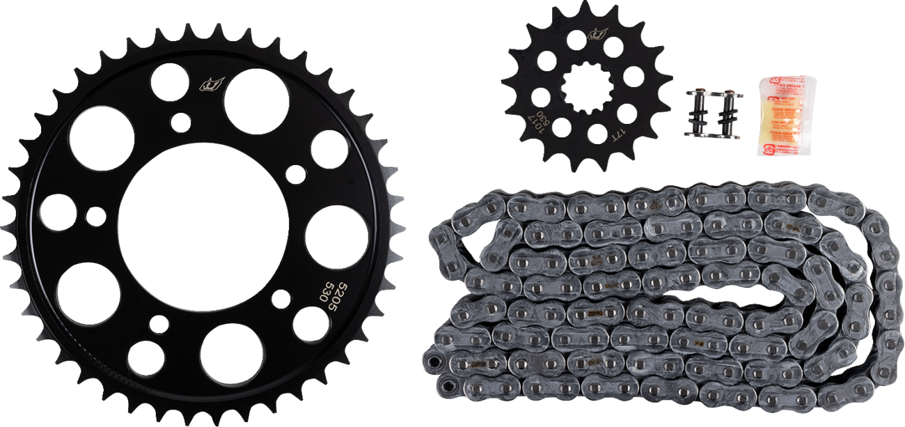 • Kit includes a premium Driven® C45 steel alloy black case-hardened rear sprocket paired with Driven® C45 steel case hardened and quenched front sprocket