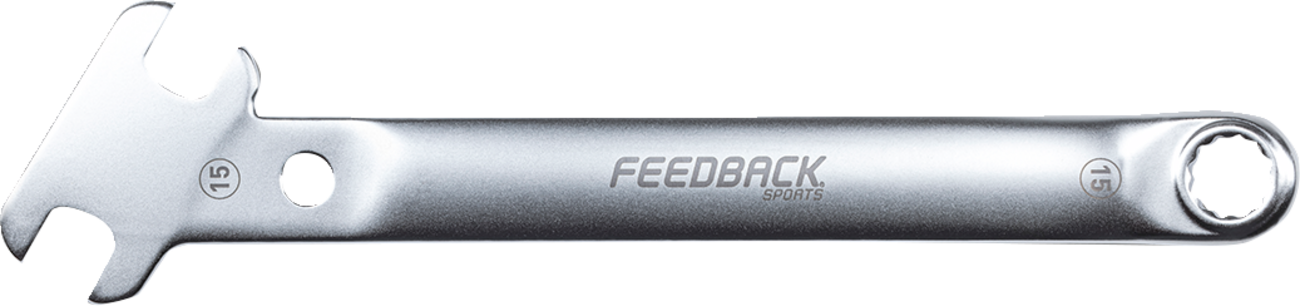 Forged, hardened CRV tool steelTwo different pedal flat angles for leverage and efficiencyAngled 15 mm axle nut wrench provides clearance away form wheelsBead-blasted, matte finish