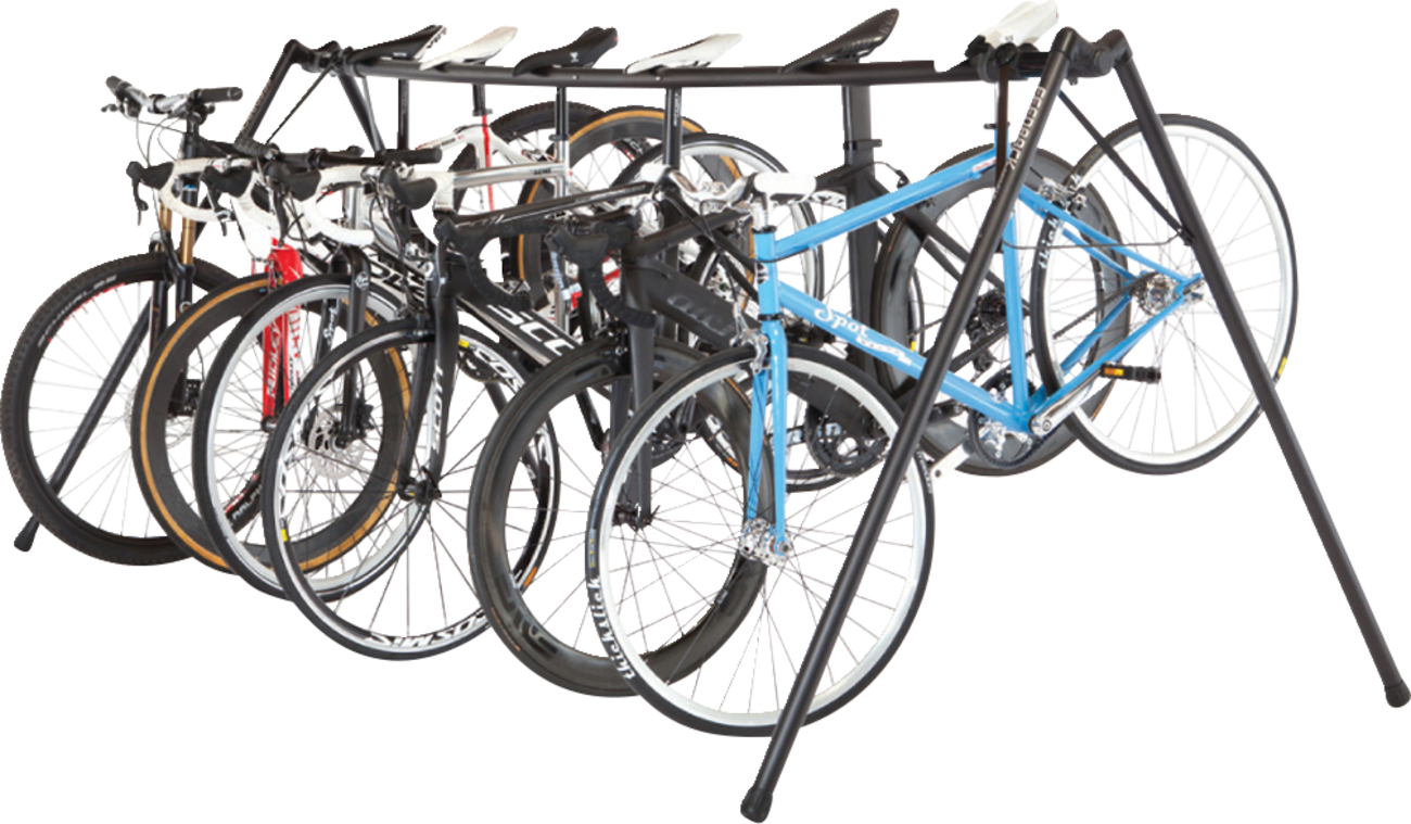 Ideal bicycle storage space for bike races, gran fondos, triathlons, demo events and community cycling eventsVersatile design allows for bike parking without risk of scratching bikes or damaging componentsSystem fits most any road bike, cyclocross bike, mountain bike, fitness bike, electric bike, or kids bikesInnovative design easily folds to a compact unit when not in useTool-free design makes setup and breakdown quickAnodized 6000-series aluminum body is lightweight, corrosion resistant and incredibly durableProvides bike parking solution for up to 200 lbs (90 kg) of bikesTotal width safely accommodates up to eight bikes (not to exceed 200 lbs / 90 kg)Wide support base and rubber coated feet provide stability on any surfaceIncluded travel bag is water-resistant, durable and padded to protect your stand and your other equipmentAt 17.6 lbs (8 kg) taking this versatile bike storage system along is never in doubt100" x 48" x 60" when set up