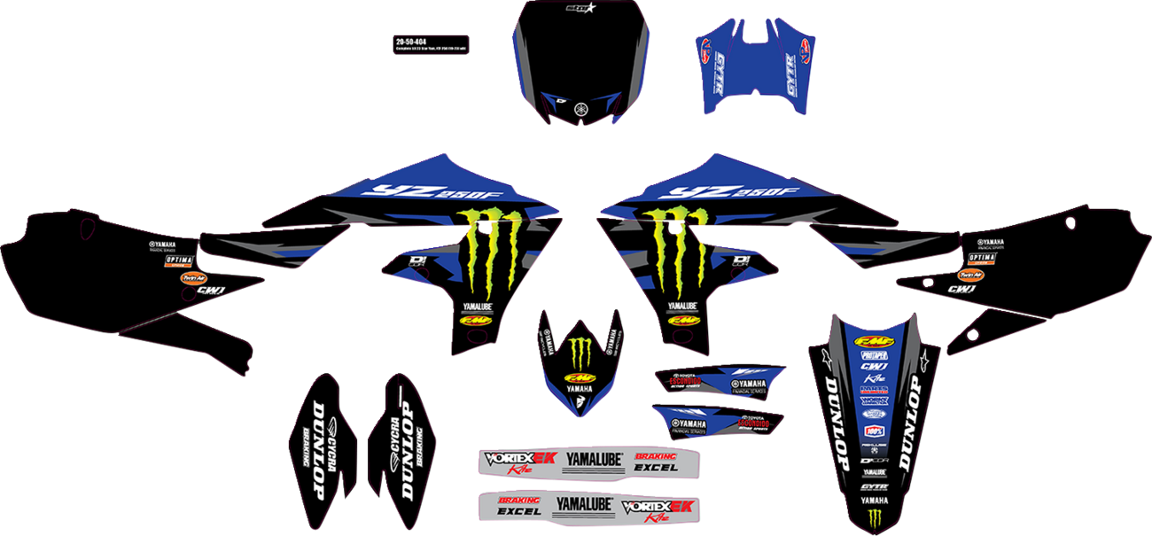 Includes decals for radiator shrouds, tank, number plate, airbox, lower fork guards, front fender, rear fender and swingarmSpecs