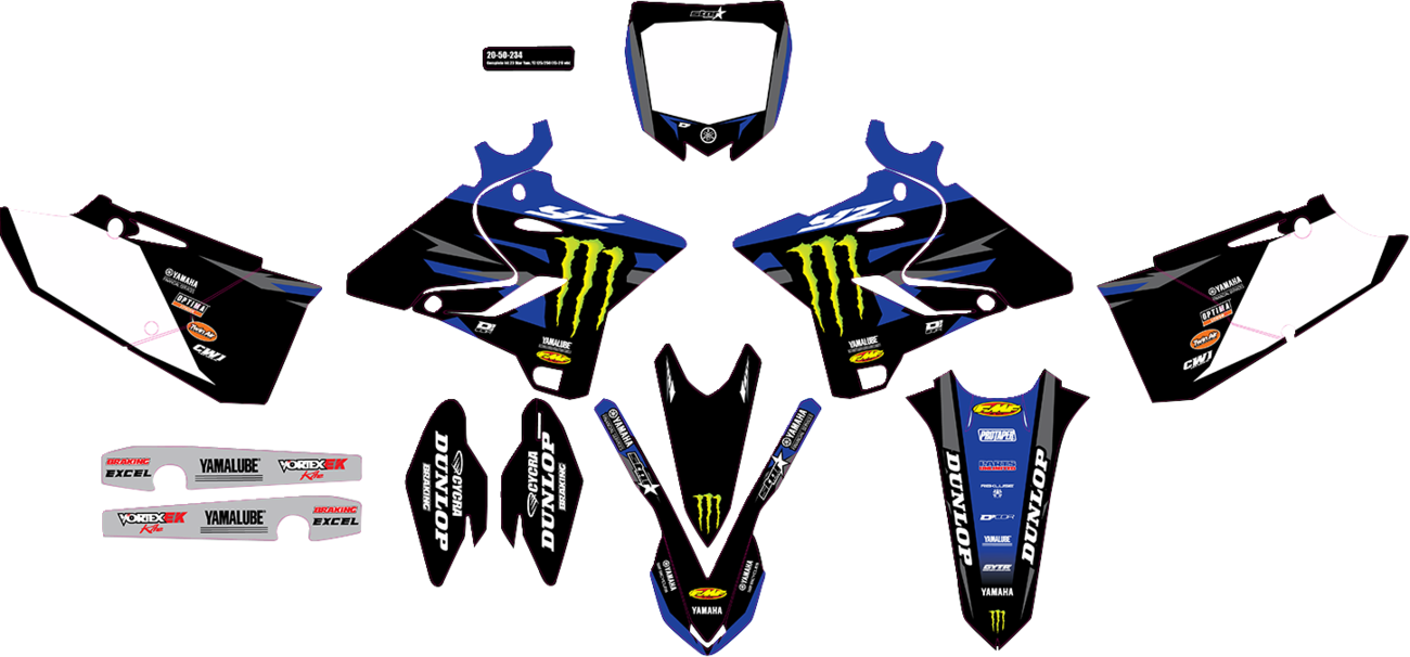 Includes decals for radiator shrouds, tank, number plate, airbox, lower fork guards, front fender, rear fender and swingarmSpecs