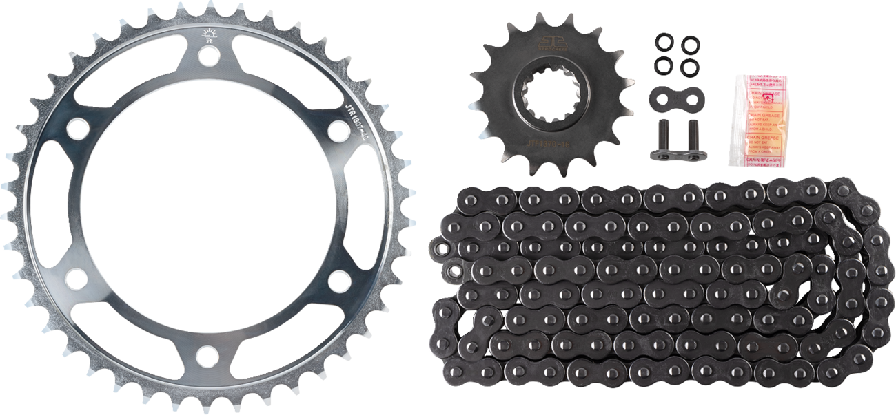 Low Friction X-Ring® ChainChromoly Steel Front SprocketHigh Carbon Steel Rear SprocketThe X-Rings twist between the side plates instead of being squished to reduce friction and minimize power lossHigh carbon rear sprockets are heat treated for maximum durability and long lifeCountershaft sprockets are made from chromoly steel for superior strength and durabilitySpecs