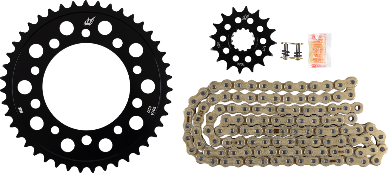 • 520 Aluminum Race kit features RK’s premium, lightweight RX or XW-ring sealed racing chain with a gold finish