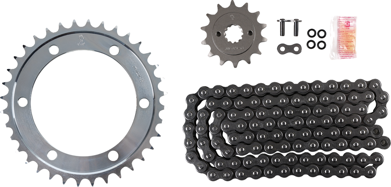 Low Friction X-Ring® ChainChromoly Steel Front SprocketHigh Carbon Steel Rear SprocketThe X-Rings twist between the side plates instead of being squished to reduce friction and minimize power lossHigh carbon rear sprockets are heat treated for maximum durability and long lifeCountershaft sprockets are made from chromoly steel for superior strength and durabilitySpecs