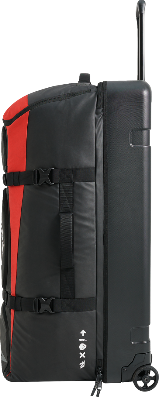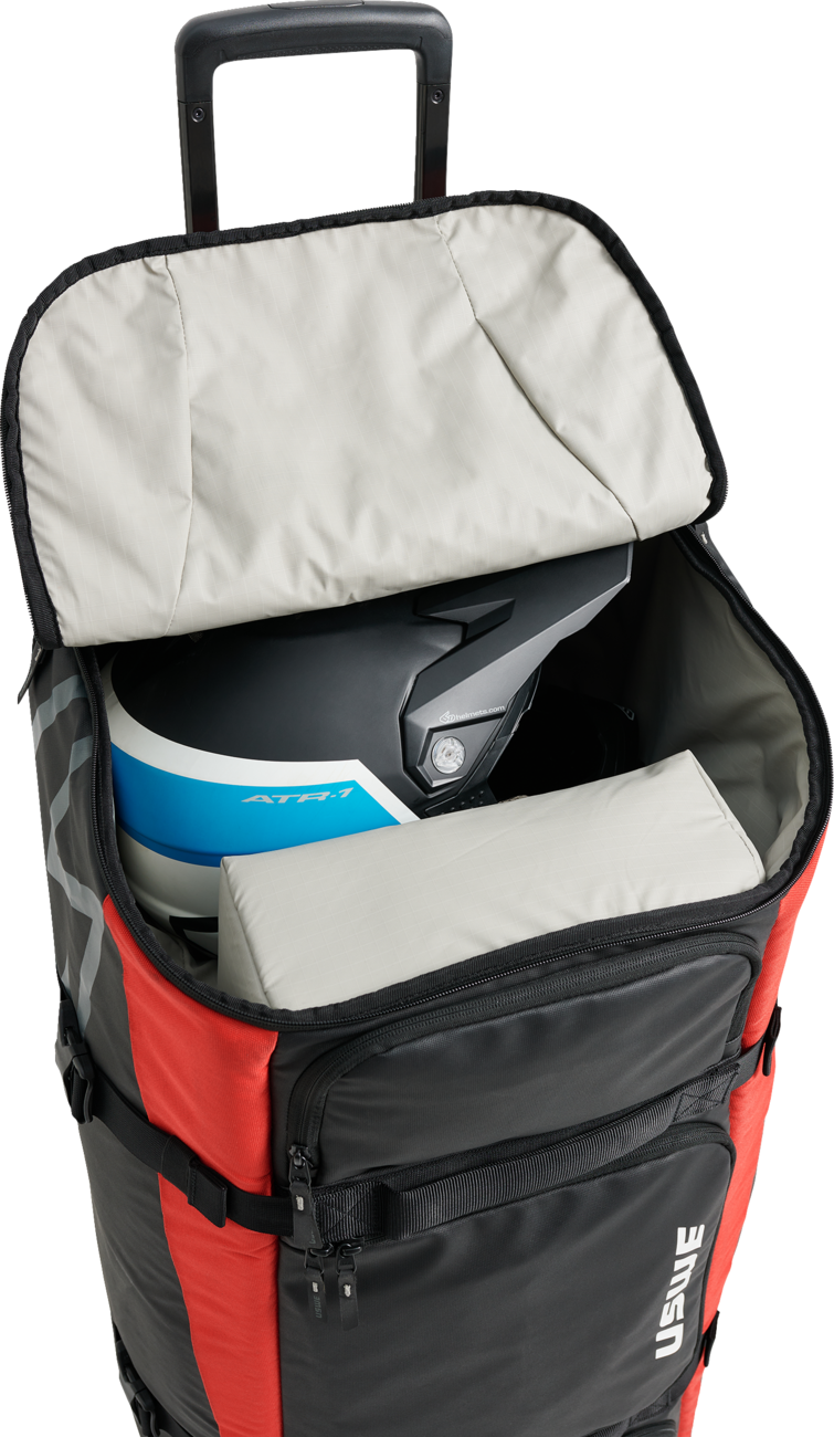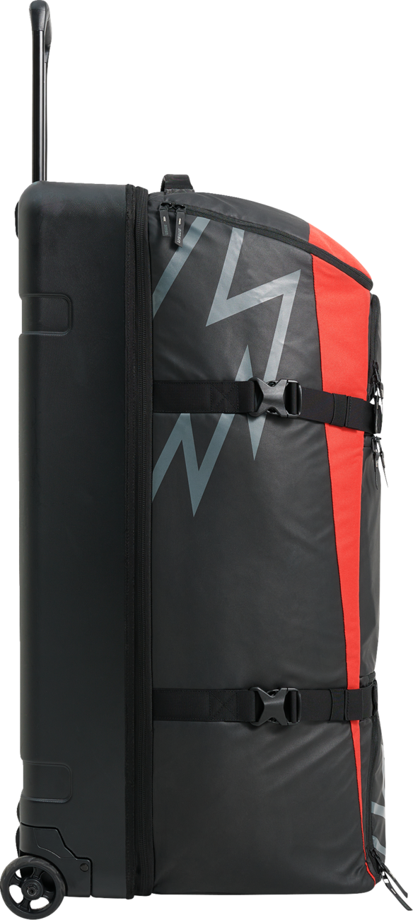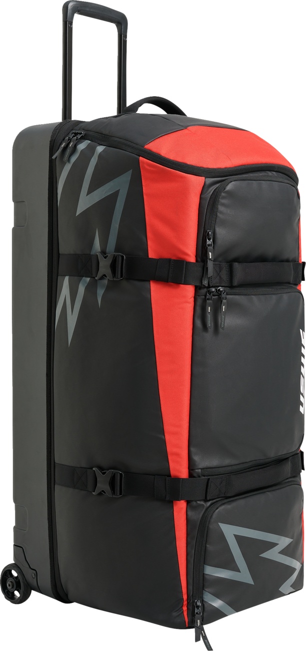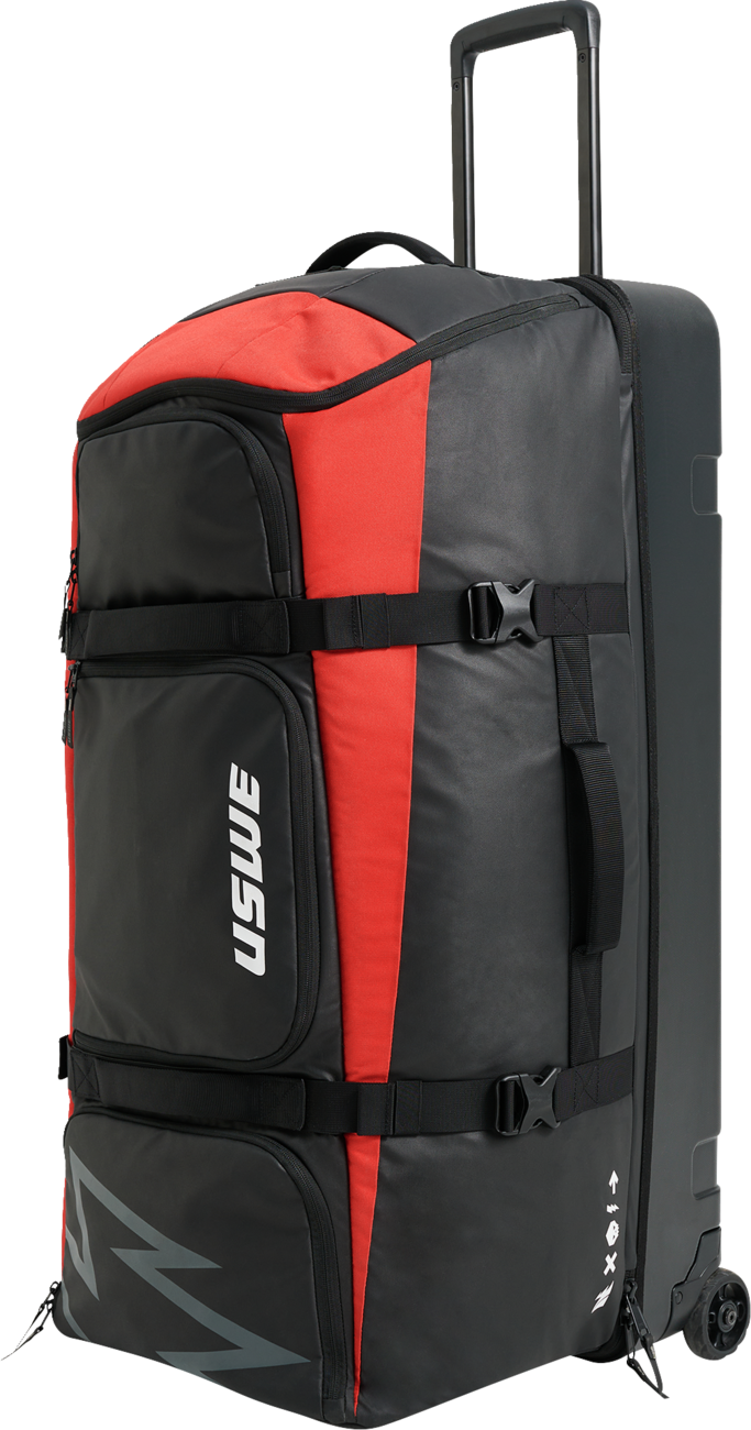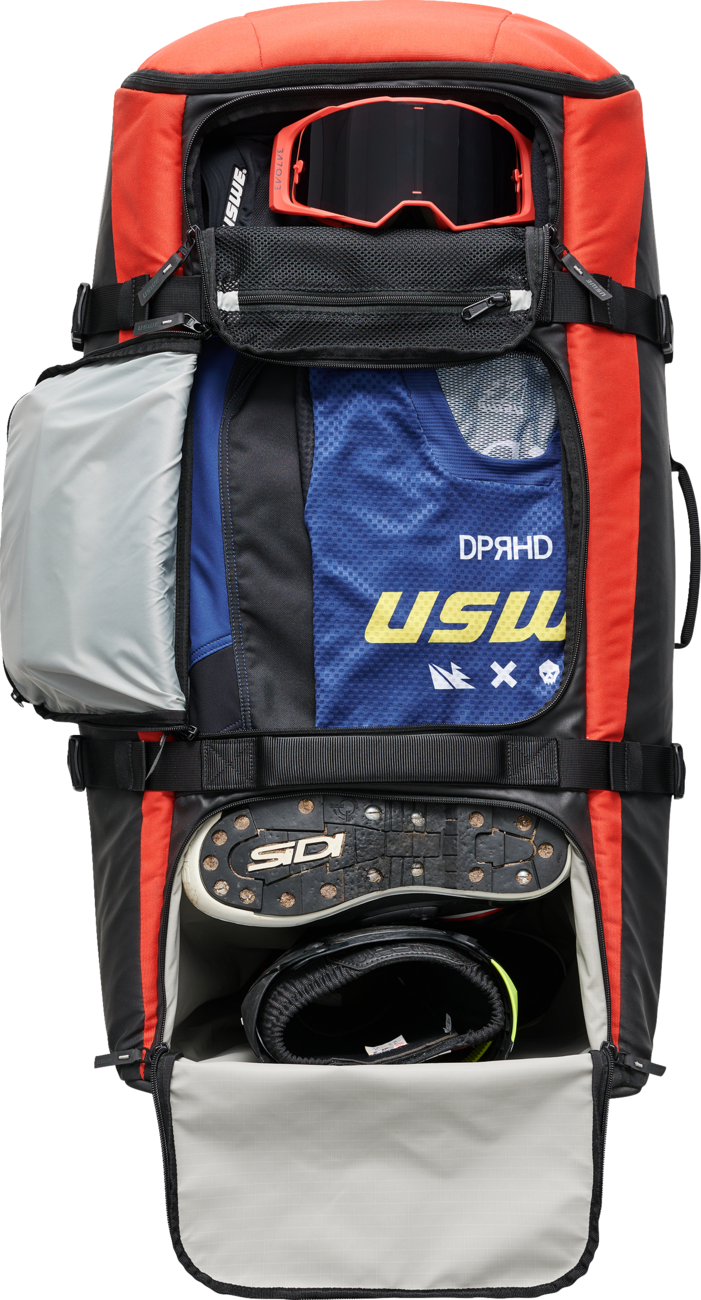 Four main compartments including boot and knee brace pocket with a waterproof liner, padded helmet section, goggle vault, and generously sized main compartment for multiple gear sets, protective equipment and gear to change into after the race100% waterproof foldaway changing mat can be tucked away discretely after useLightweight hard shell moulded polycarbonate baseHeavy duty wheel assemblyTelescopic handle