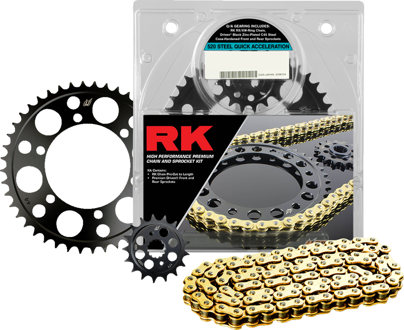 Kit includes a premium Driven C45 steel alloy black case hardened rear sprocket paired with Driven C45 steel case hardened and quenched front sprocketRKs 520 Steel Quick Acceleration Race Kit combines the enhanced performance of race gearing and durability of steel componentsKit includes a one-tooth-smaller-than-OE front sprocketSpecs
