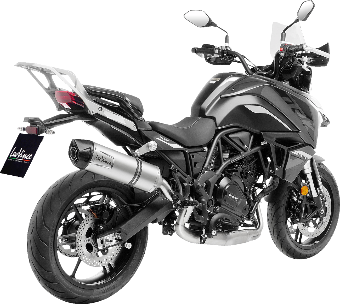 AISI 304 stainless steelFull carbon fastening strapFull carbon "Slash Cut" end capHigh temperature resistant packing (1,650 F)Laser etched LeoVince logoSpecs