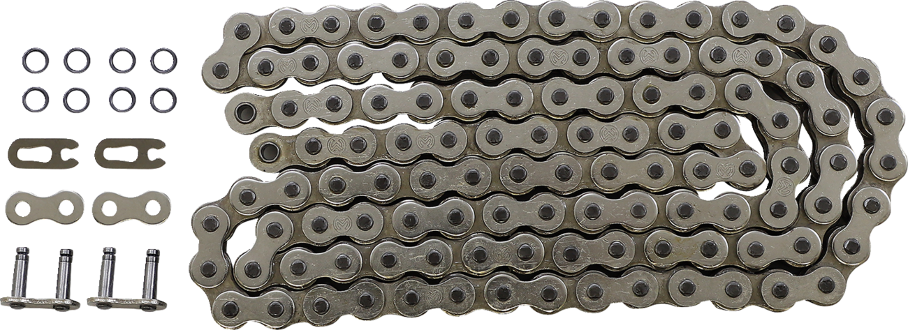 O-ring chainExtra-high-tensile-strength link platesRust-resistant nickel-plated side platesVacuum-injected greased chainSolid bushingsRecommended for applications between 350-450ccClip-type connecting link includedReplacement connecting link available
