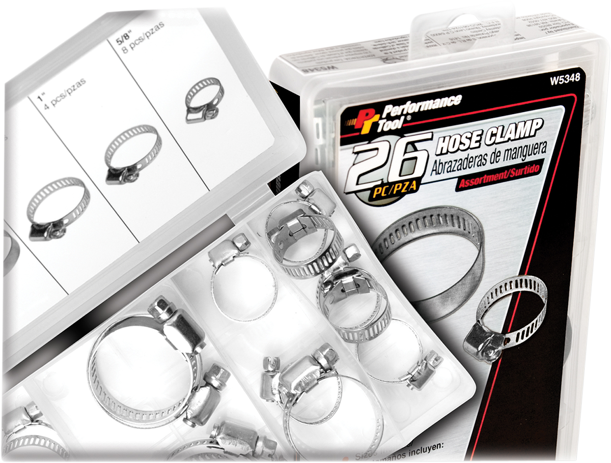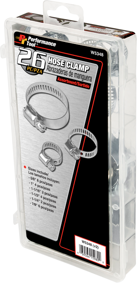 Includes eight 5/8", six 7/8", four 1", two 1-1/16", two 1-1/4" and four 1-1/2" hose clampsComes in a convenient resealable plastic case