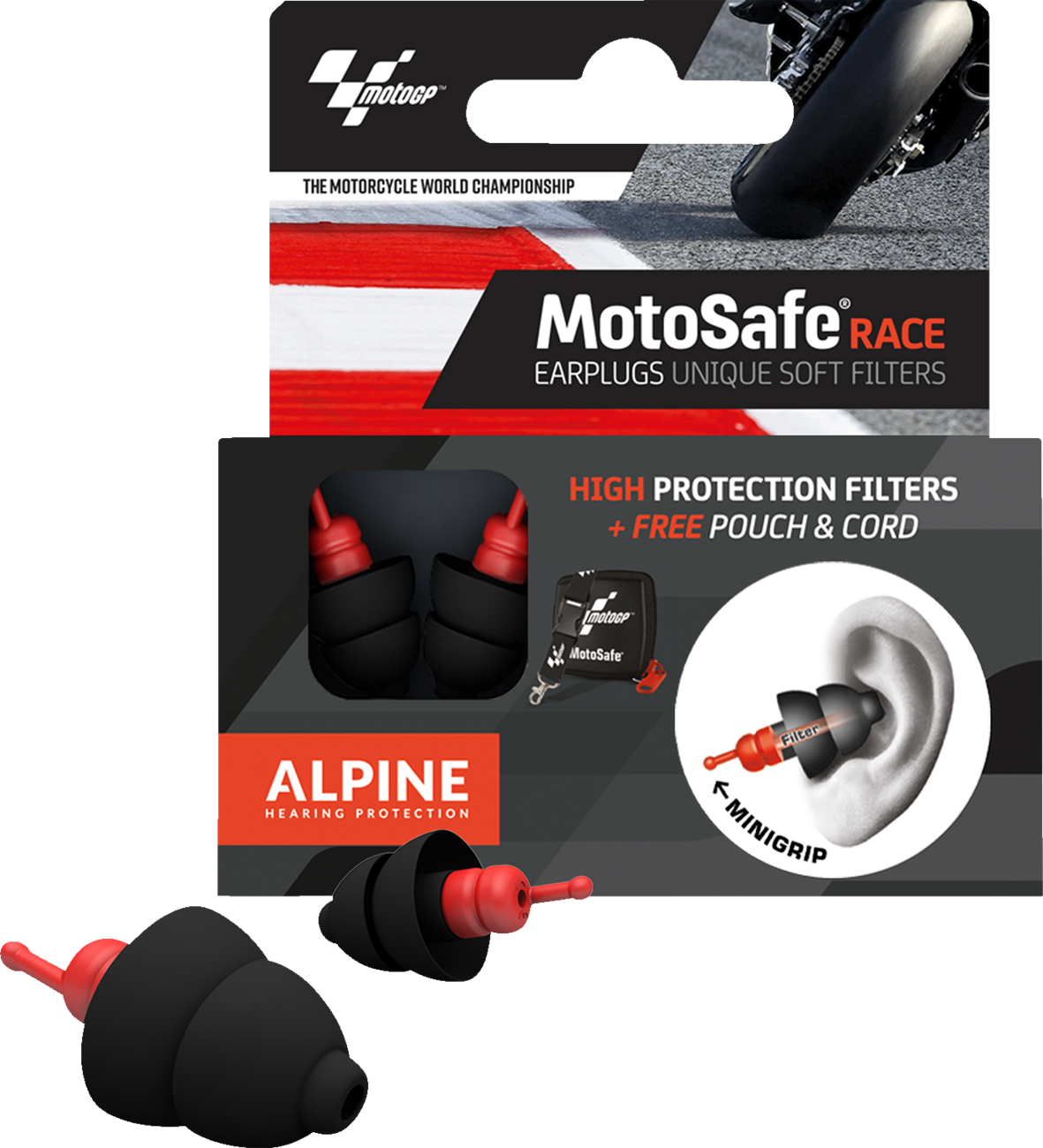 Ideal for on the highway, the circuit, or with an open helmetAttenuate harmful noises without giving a sense of isolationTraffic, navigation, intercom, and the motorcycle itself remain sufficiently audible, thanks to the AlpineAcousticFilters™Includes two universal earplugs with acoustic filters, MotoGP branded travel pouch, MotoGP branded lanyard, and Alpine insertion tubeAlpineThermoShape™ materialNo siliconeReusableProtects against harmful noise and reduces tiredness caused by wind noise
