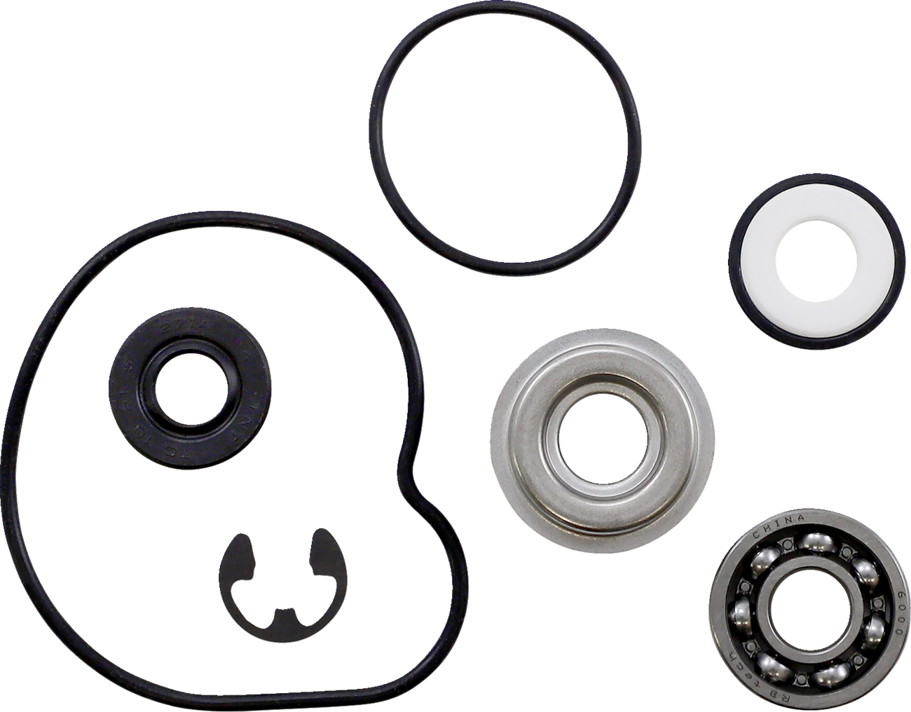• Typical kit includes the following: bearings where applicable; rubber seals; mechanical water pump seal where applicable; side cover gasket; water pump gasket; snap rings located on water pump shaft and copper drain washers