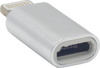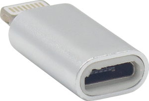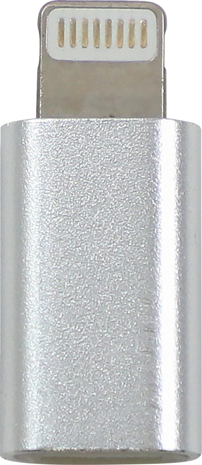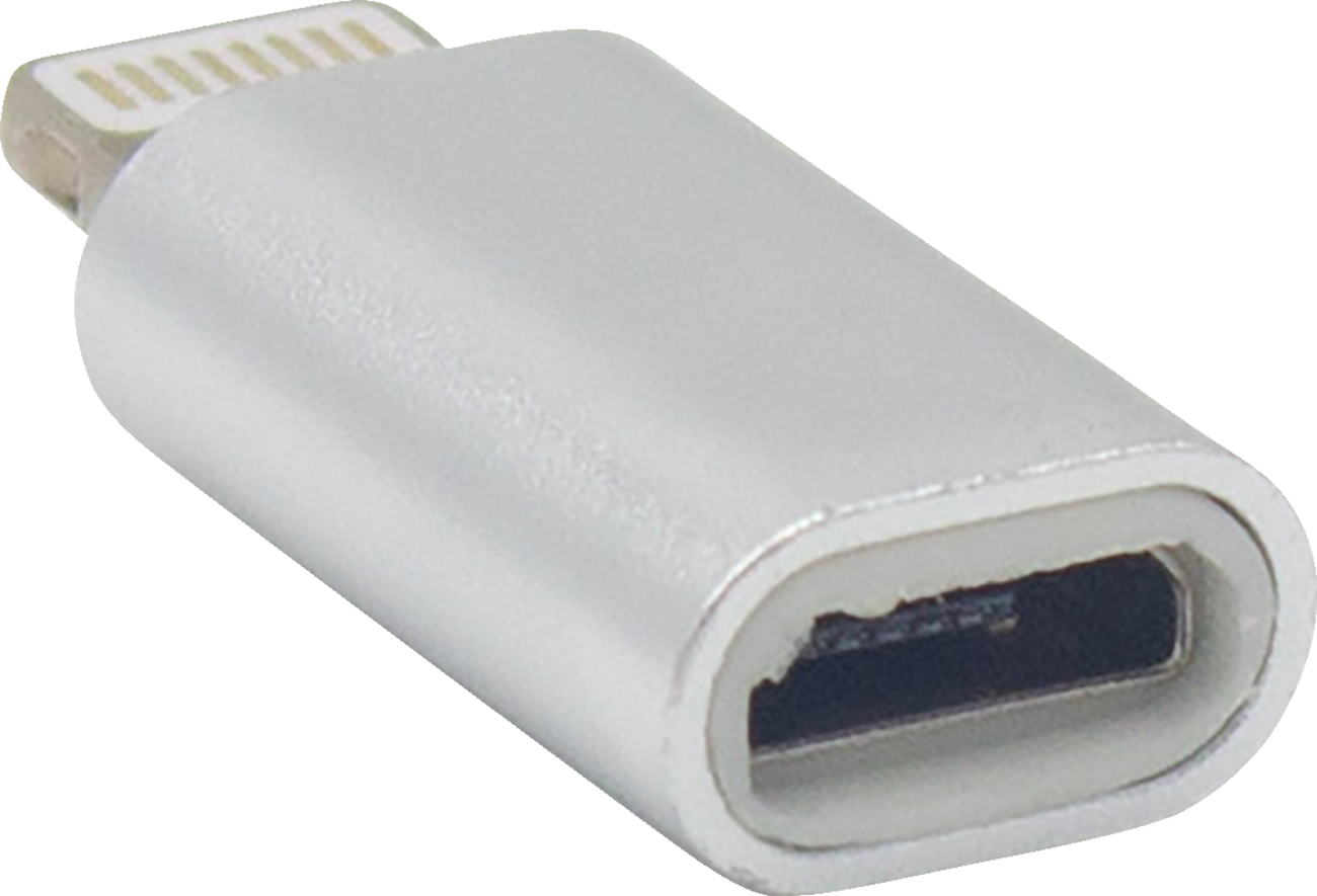 Female micro USB to male lightning adapter connects between a cable with a male micro USB and a device with a lightning port to charge your device