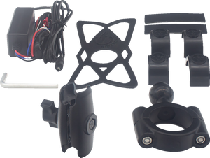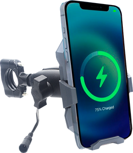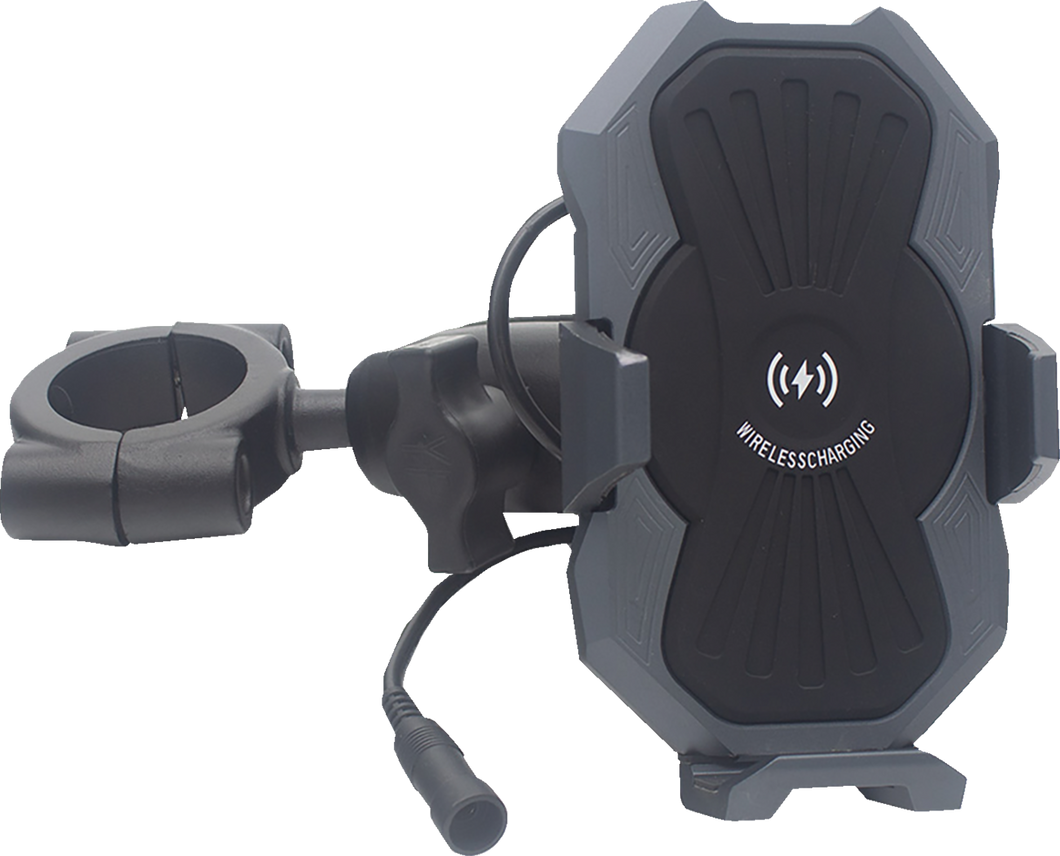 Includes 12 - 24 V DC input, 74" quick disconnect power cable, hardware for 1-1/2" handlebar mounting and a sling for added securityFeaturing an inductive Qi charging technology with a signal frequency of 127kHz and voltage regulationHold and charge your phone with this innovative metal wireless charging phone mountThe mount is metal and designed rugged for powered sport vehicles8 mm (1/4") distance from wireless charging areaDelivers up to 15 W of charging powerQuick phone insertion featureWaterproof IP67 ratedVibration dampening