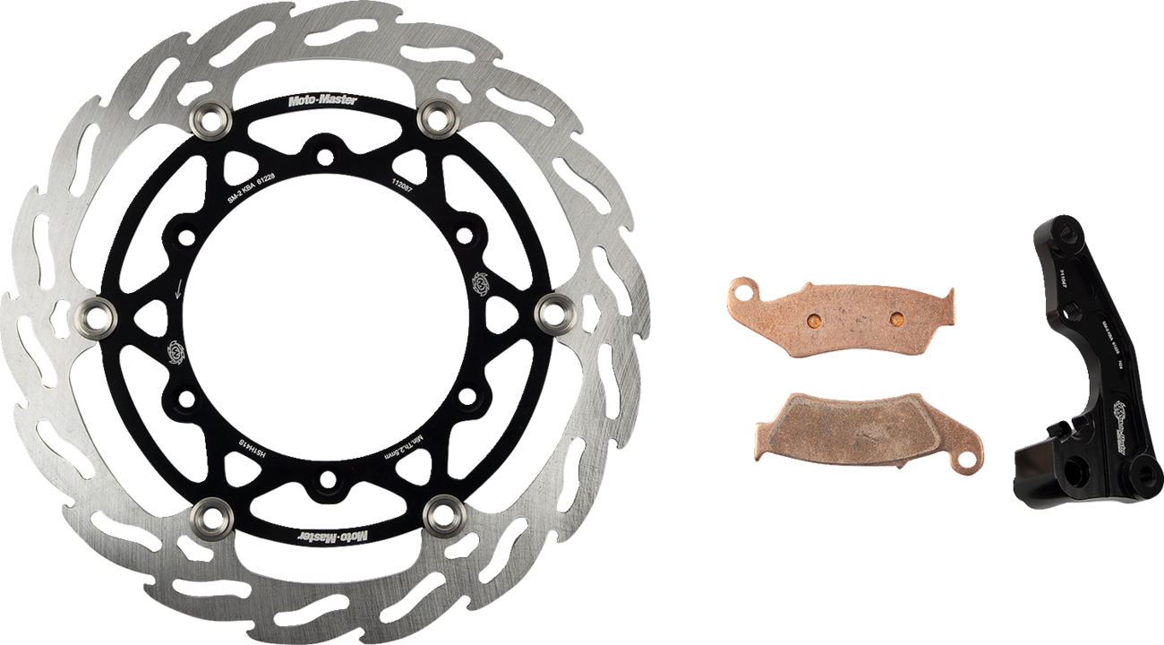 Kit Includes flame brake rotor, racing compound brake pads, and caliper relocation adapterSpecs