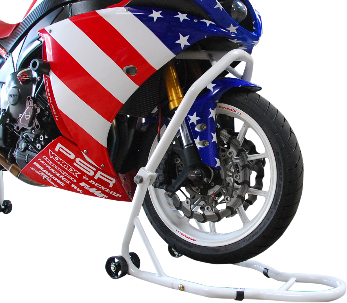 A must have for removing and servicing forks, removing front wheel and replacing brake pads and rotorsFront stand lifts from under the lower triple clampBike model specific pins are sold separately
